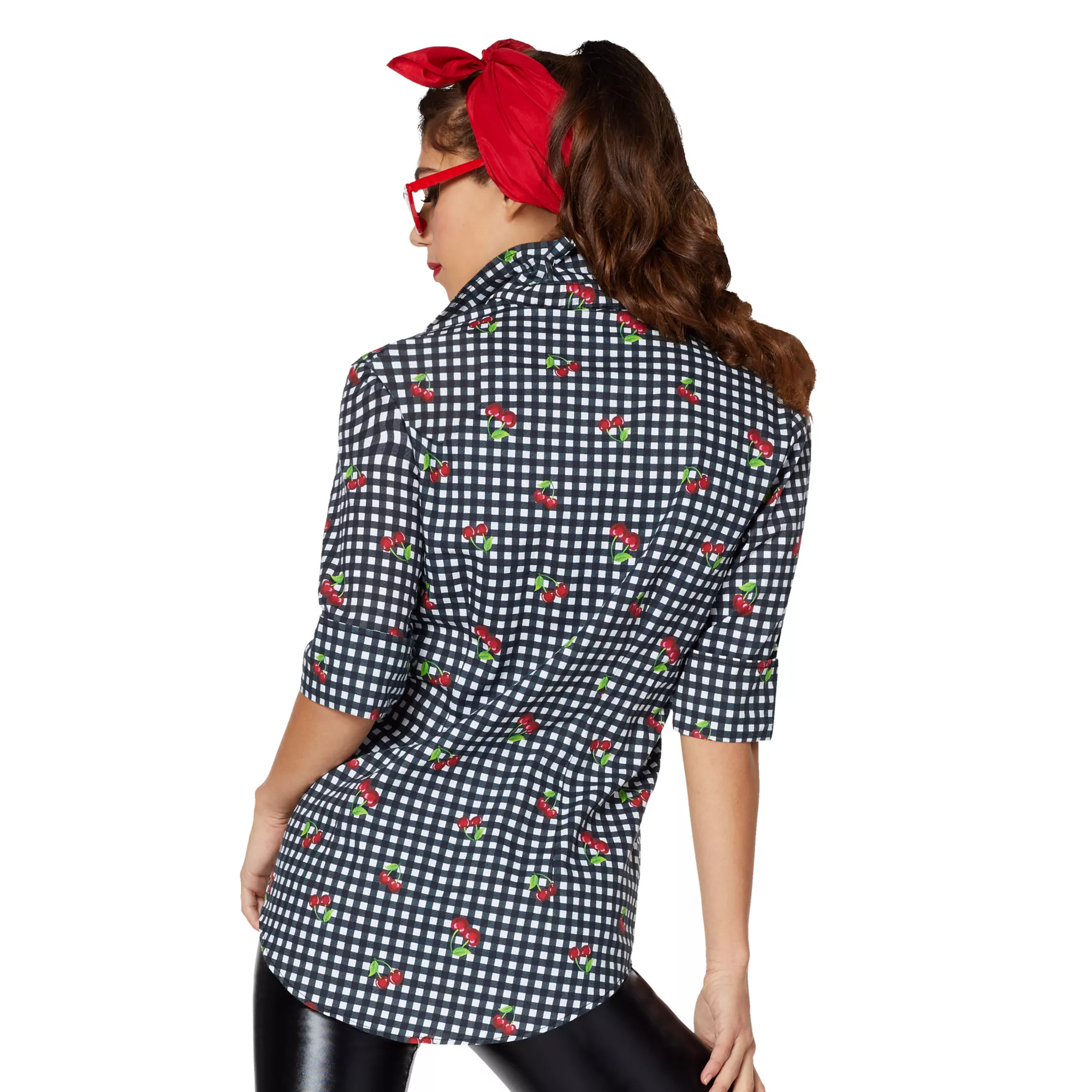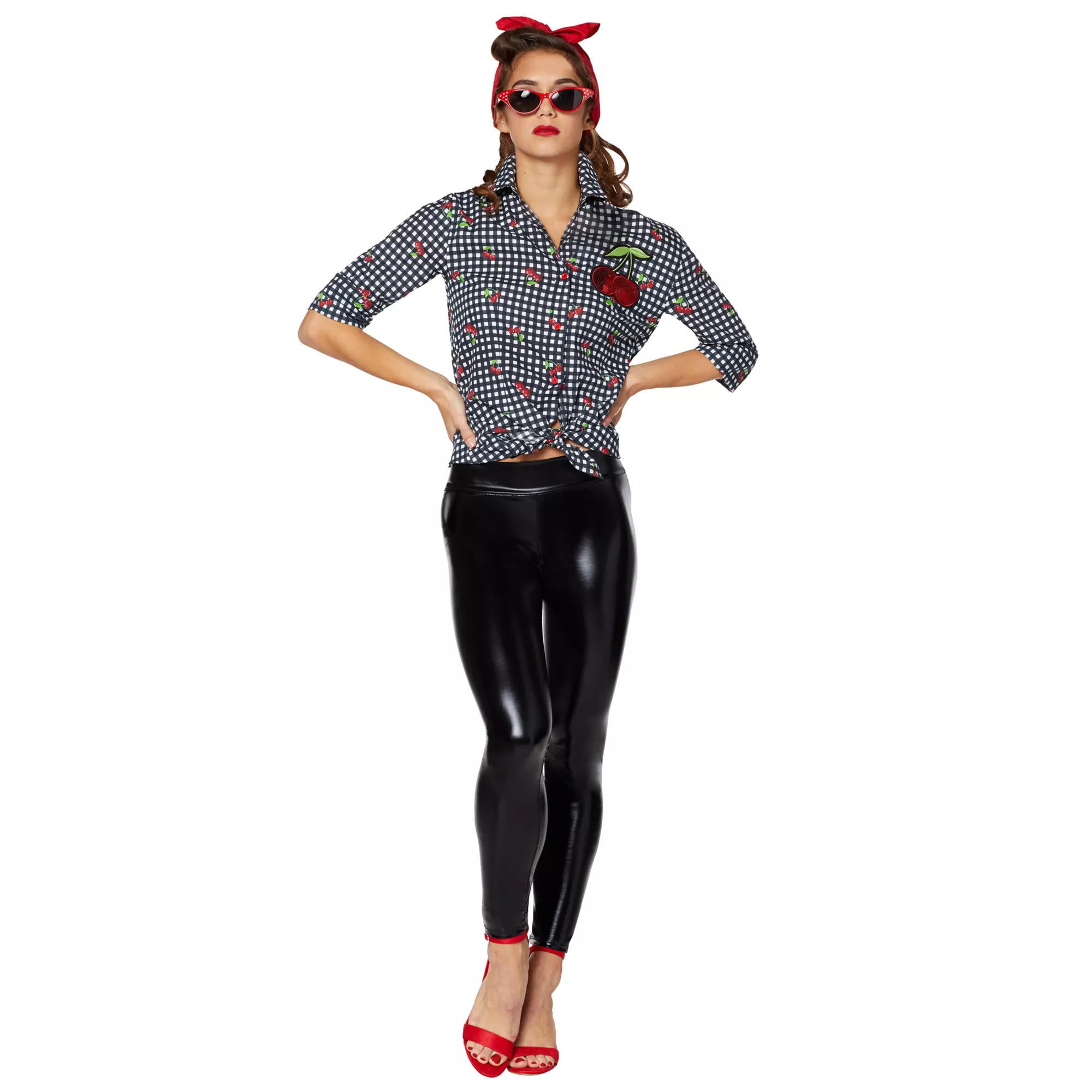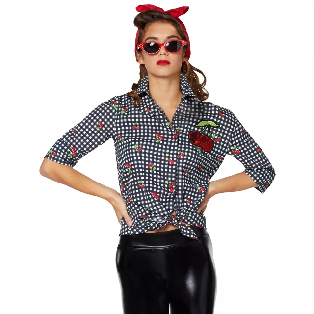 Bring the 1950’s to life when you create your own costume with this '50s girl costume kit. The plaid cherry-print button down shirt features a tie detail at the belly and a large sequin accent that will bring you back to the greatest decade ever! Add the included red scarf and bedazzled sunglasses for a look that is to die for! Pair it with your favorite pair of pants (sold separately) and you’ll be the one to beat at the next costume contest.