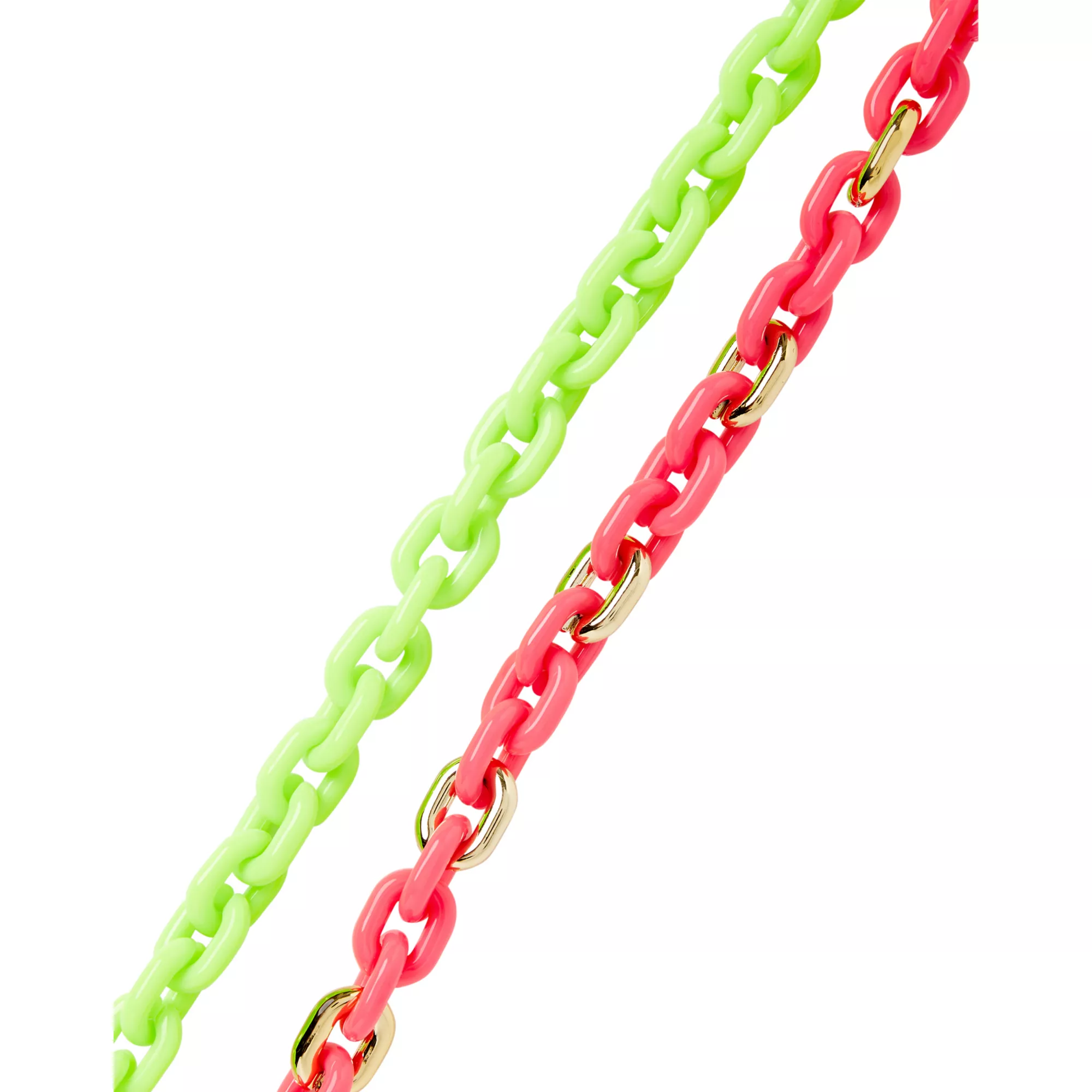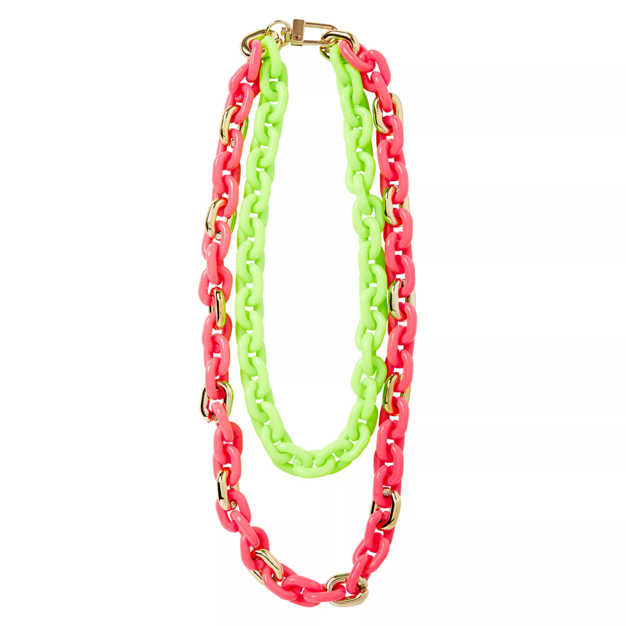 Go bright with this neon pink and green chain-style '80s necklace! This colorful jewelry is the perfect accessory for any eighties costume. You'll be sure to get noticed, with the goldtone links set against neon pink and neon green links.