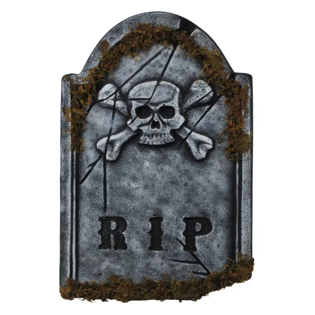 Transform your home into a haunted cemetery with this authentic and ancient looking moss covered Skull Face Tombstone. It makes a great centerpiece for any spooky setting or ghostly graveyard!