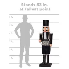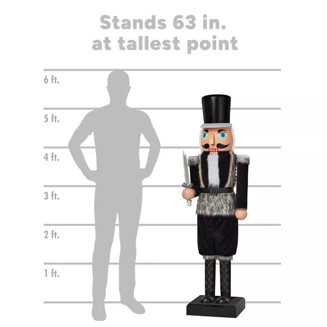 Son of a nutcracker! Spread Christmas cheer when you decorate with this Collapsible Black Soldier Animated Nutcracker. Standing 5 feet 2 inches tall, this holiday icon is dressed in a matte black suit with a fuzzy fur trim and carries a light-up sword prop. It's fully collapsible for easy setup, disassembly, and storage. Turn up the holiday cheer as it plays a rendition of “Jingle Bells,” while the mouth opens and closes. Whether placed by your tree, in an entryway, or as the centerpiece of your holiday party, this Soldier Nutcracker is sure to wow your guests!