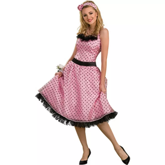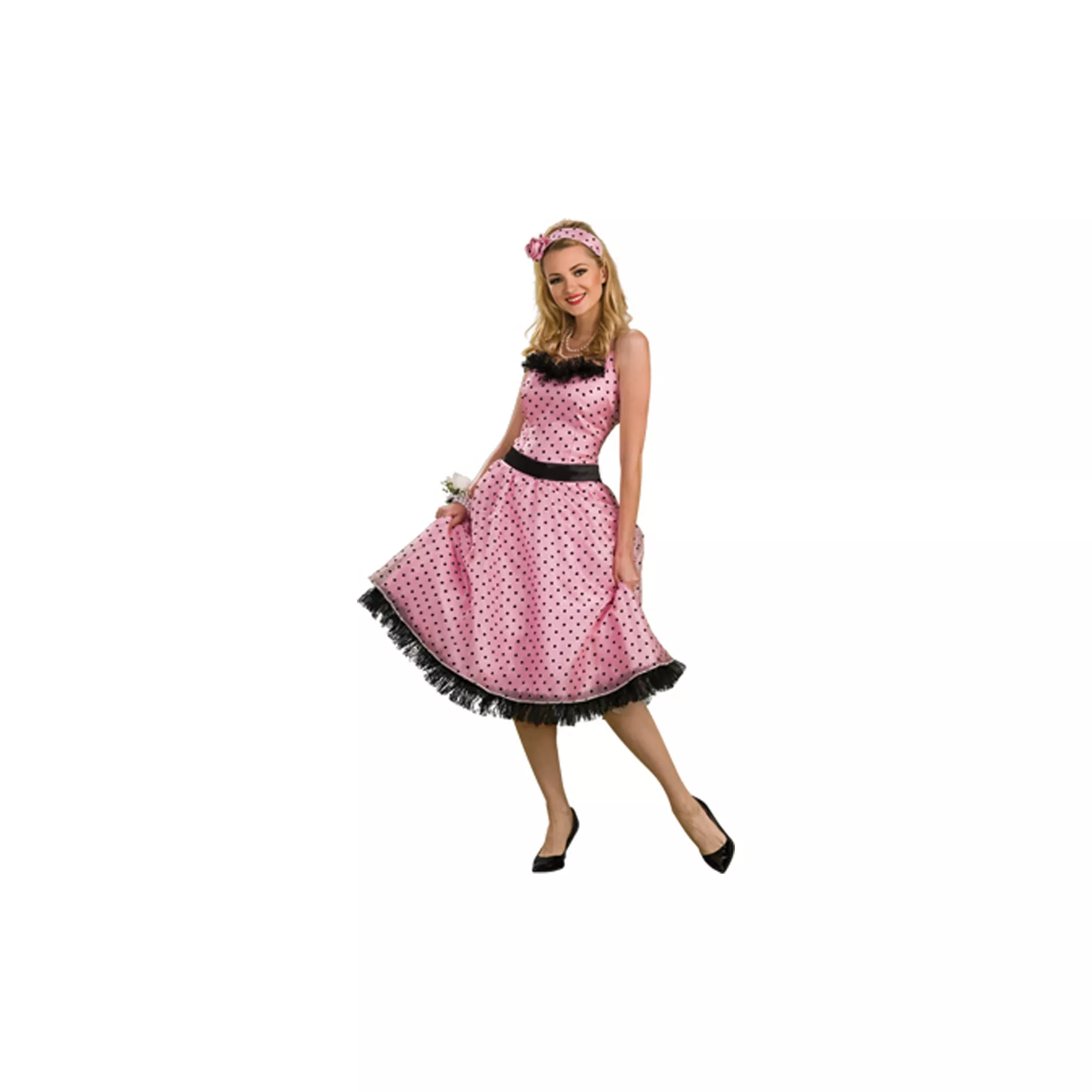 Don't be a wallflower on Halloween - dance the night away when you wear this classic 50's Prom Dress adult womens costume. The pink and black polka dot dress of this womens retro costume features fringe trim and comes complete with a black belt and a matching head sash.