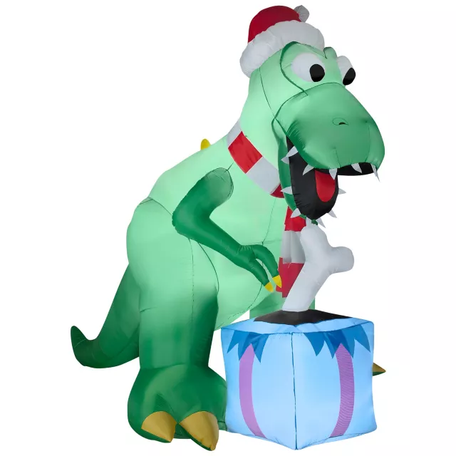 Even dinosaurs want to open presents and with this Holiday T-Rex Airblown Inflatable everyone will be able to get into the holiday spirit! The airblown inflatable features a large green T-Rex dinosaur wearing a Santa hat, red and white striped scarf, and unwrapping a blue present to get a bone. Break away from the classics when decorating your yard and use this awesome T-Rex Inflatable!
