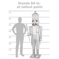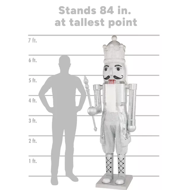 Bring holiday magic to your home with this life-sized Silver Bling Nutcracker Animatronic. Play your favorite sounds of the season with its Bluetooth audio compatibility that easily connects to your phone. This 7-foot-tall nutcracker animatronic is bedazzled with sparkling rhinestones and is dressed in a dazzling disco ball-inspired outfit.