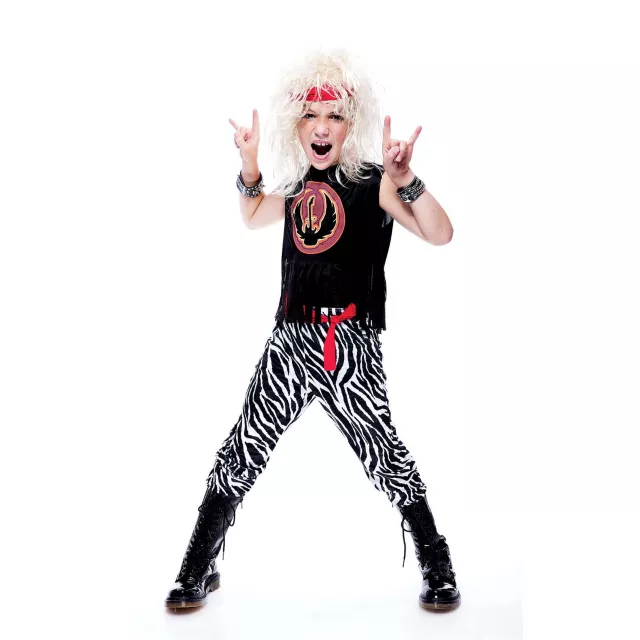 Party like a star on Halloween when you wear this retro 80's Rock God child costume. The black and white, 100% polyester zebra-striped pants of this rocker costume comes complete with a black sleeveless shirt, sash and a head scarf.