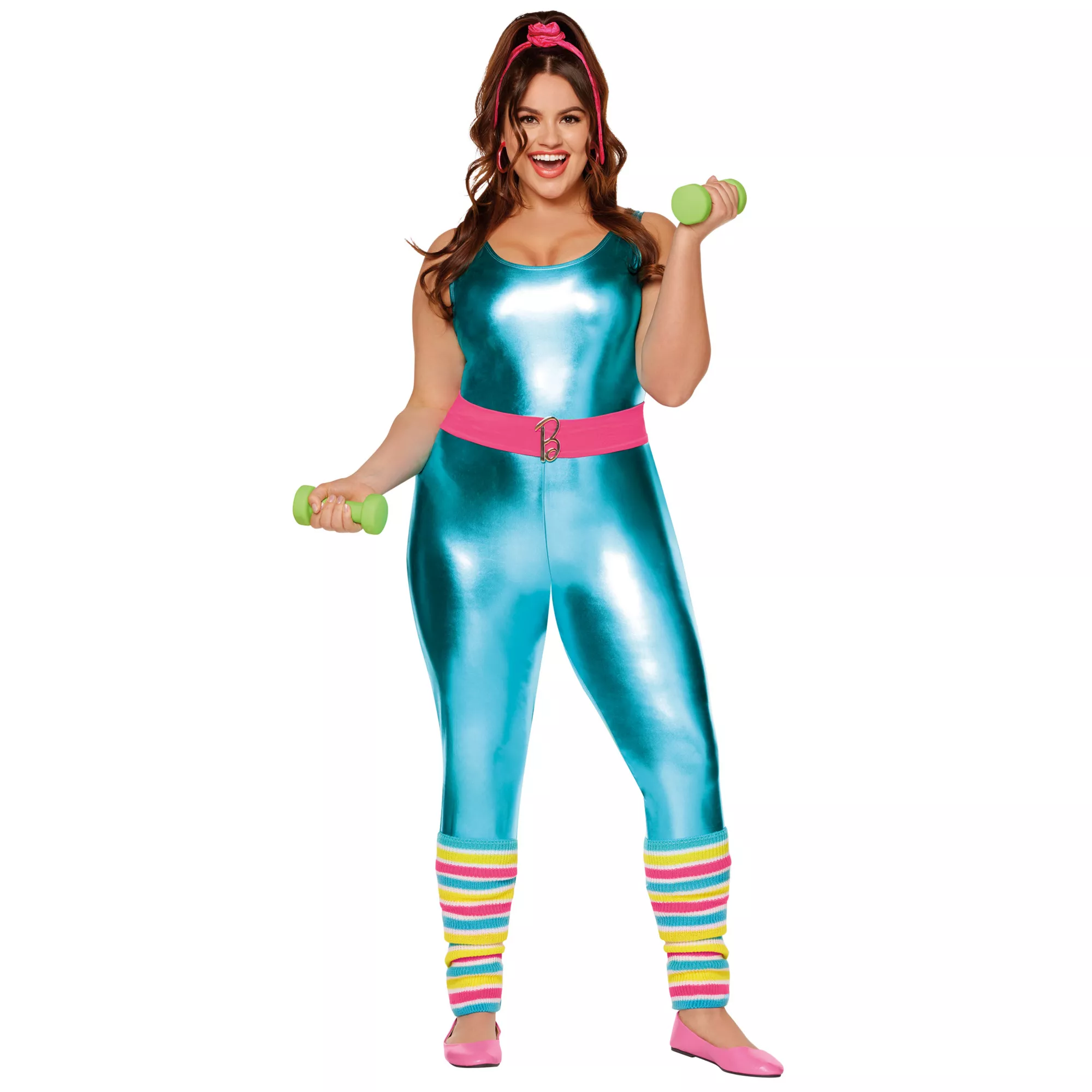 Sweat it out in style in this official Aerobics Instructor Barbie Costume! This Barbie costume includes a sleeveless teal catsuit with plenty of stretch and shine. A pink belt with a metallic "B" emblem, a pink hair scrunchie with tails, a pair of pink hoop earrings, and striped leg warmers perfect this Barbie ensemble.