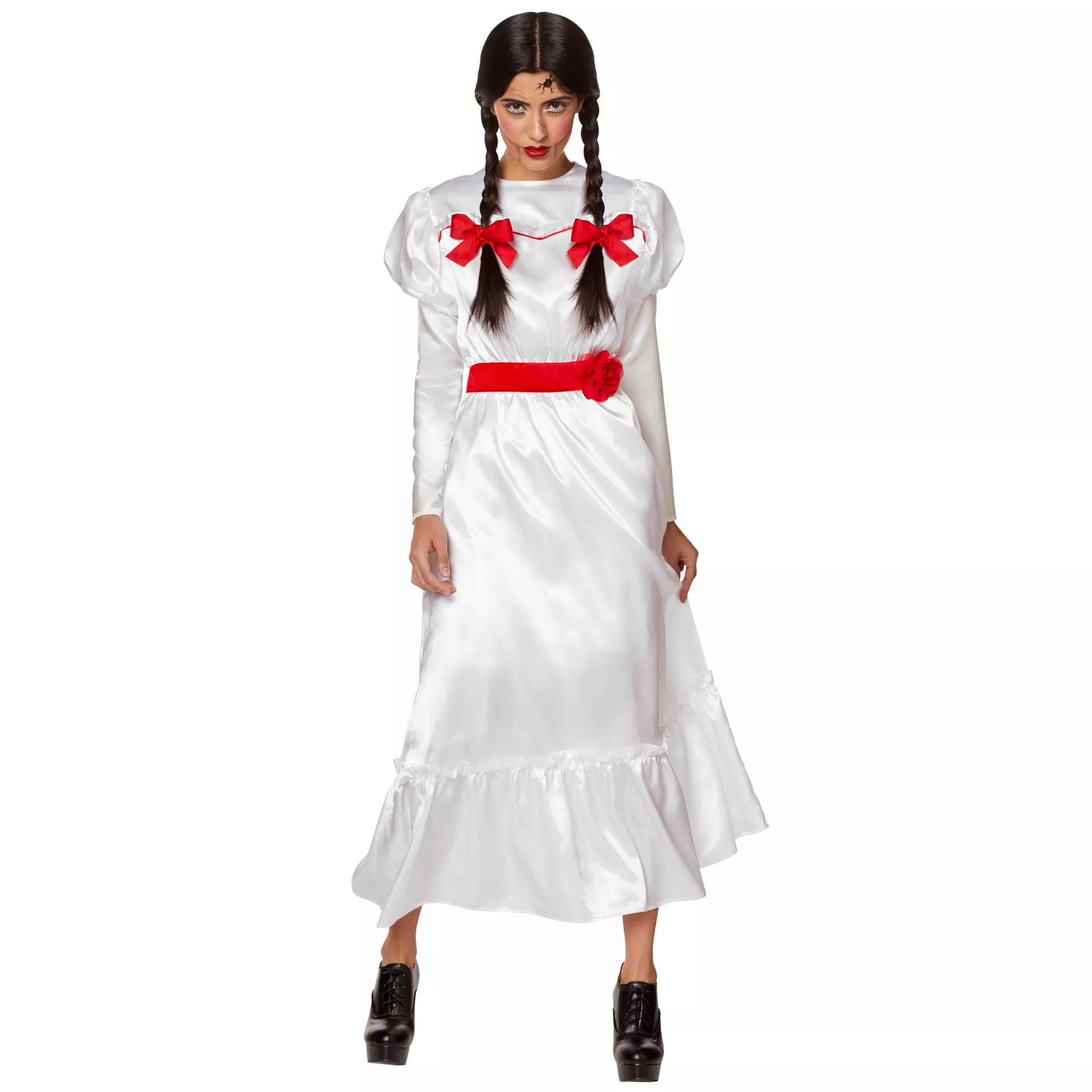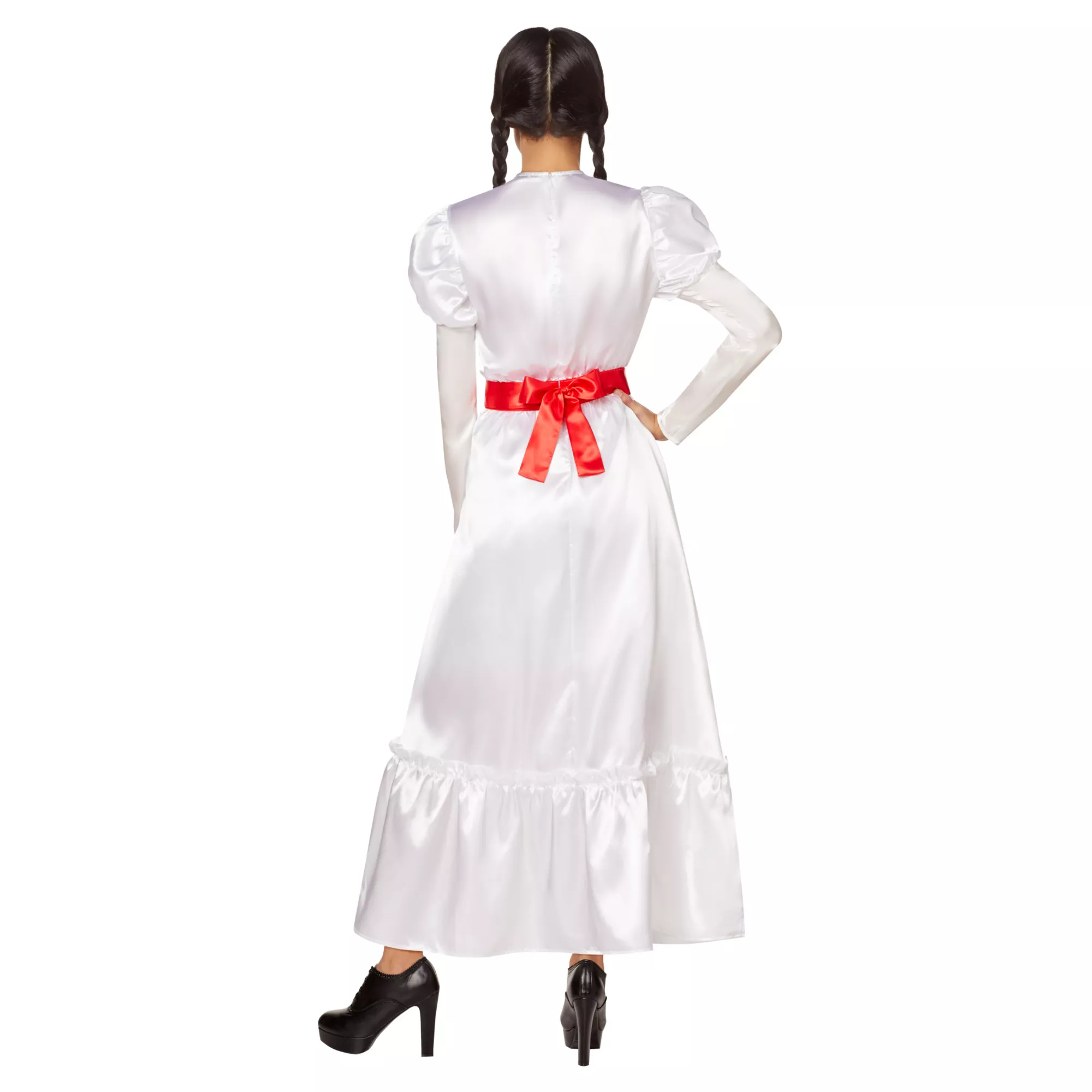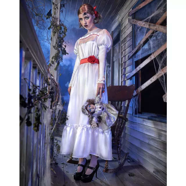 Conjure up a truly spooky Halloween in this Adult Annabelle Costume! You'll look just like the demonic doll, Annabelle, in this long, white gown with authentic red accents. Happy haunting!