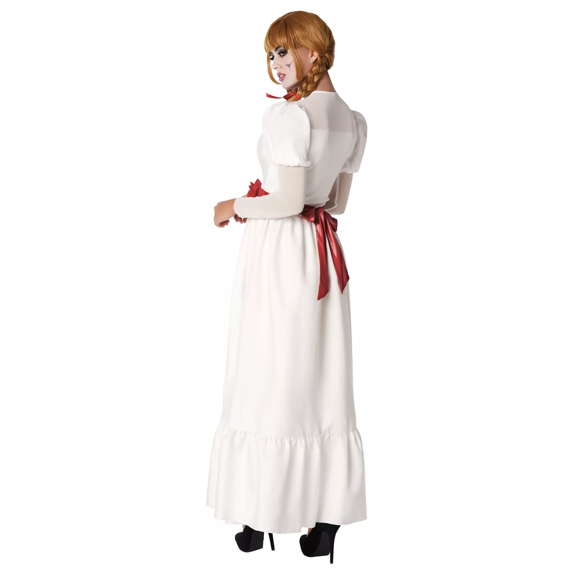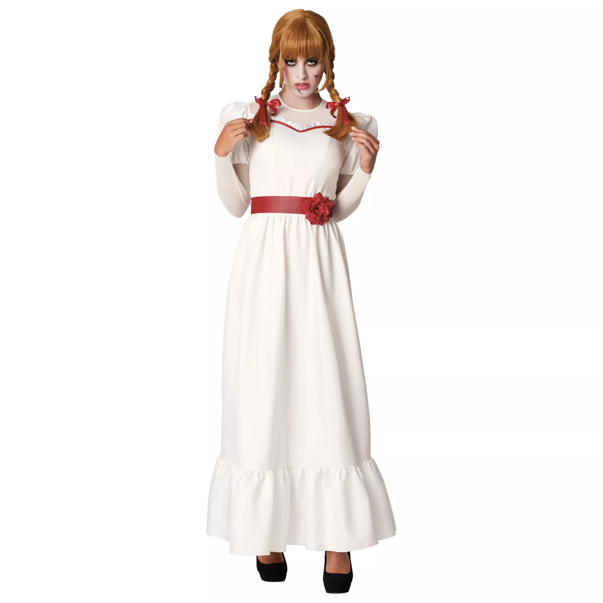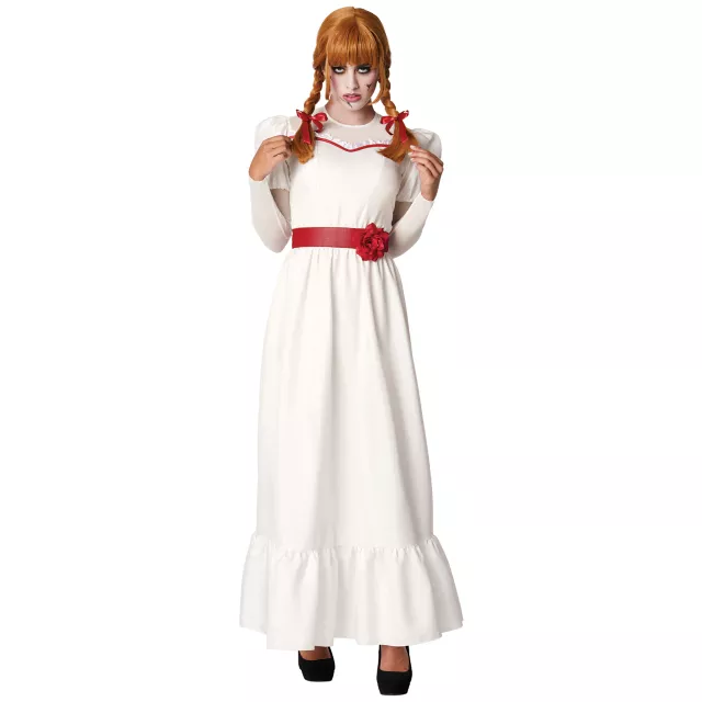 Have a haunting Halloween in this officially licensed Annabelle costume! This Annabelle costume features a long, white gown with elegant puff sleeves. Red accents line the neckline and belt of this dress, adding a spooky touch of authenticity to this cinematic ensemble. A wig with blunt bangs, two shoulder-length braids, and two red bows will instantly transform you into the horrifying Annabelle.