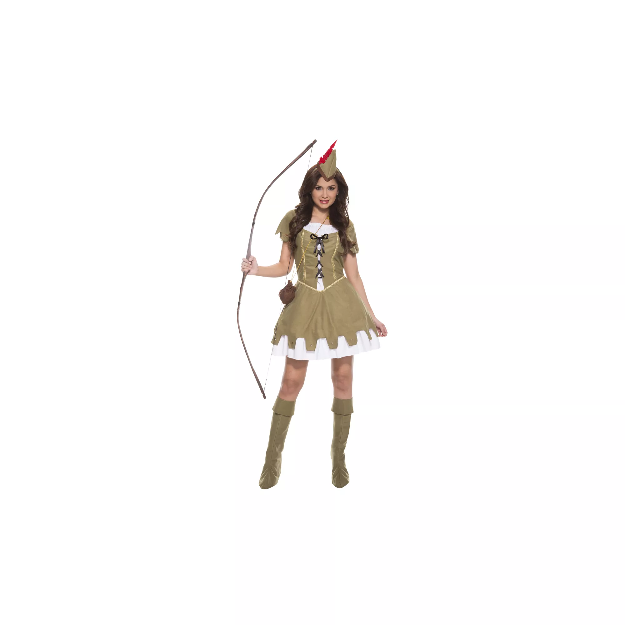 Hunt your prey this Halloween and don't hold back. What you want can be yours wearing this striking Archer adult womens costume! Dress fits snugly at the bust with ruffled short sleeves and attached flared skirt. Don't forget to accessorize with the classic archer hat, satchel, and boot covers also included.