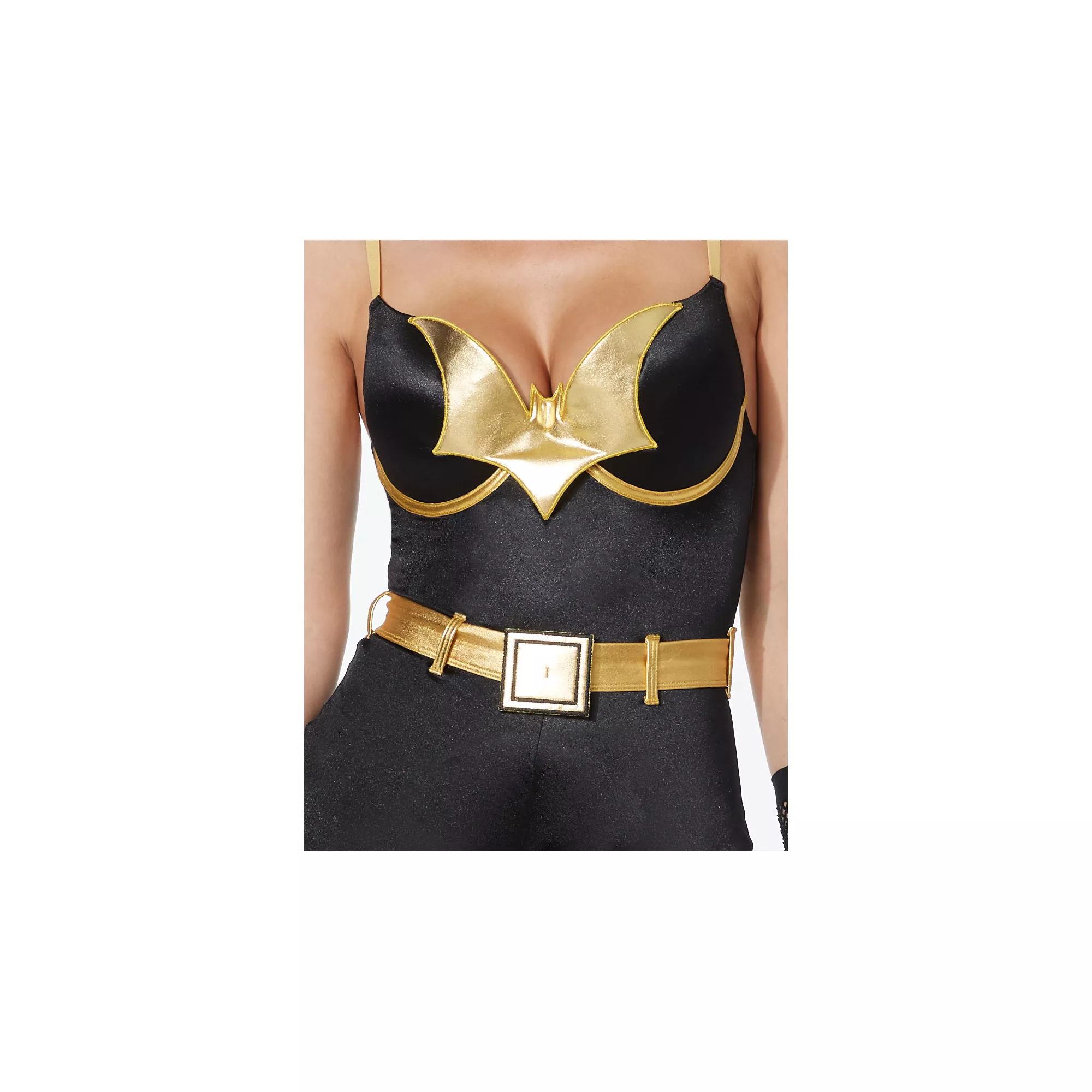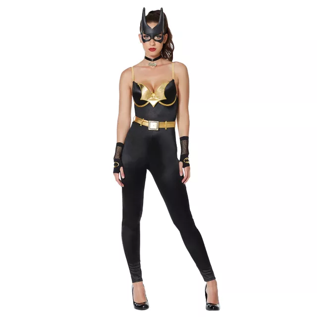 Add a fun and flirty twist to your favorite female vigilante costume with this officially licensed Batgirl catsuit! This skin tight suit is all black and features Batgirl's signature bat logo and belt in gold coloring, making it perfect for any Batgirl fan!