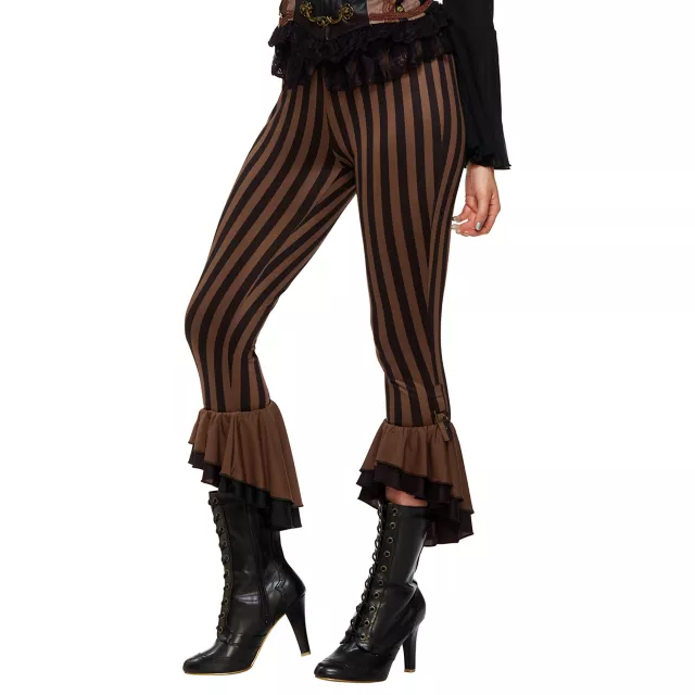 Finish off your steampunk-themed costume in style with these fun striped pants! Long black stripes travel down the length of these brown, elastic pants, and the ankles of the pants flare out in flowy black and brown material. Buckle accents can also be found at the bottom, giving it the perfect steampunk finishing touch.