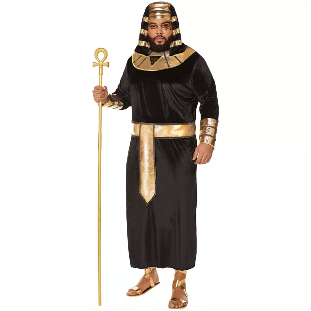 From the pyramids of Egypt to the dance floor, this pharaoh costume will make you look like an authentic ruler! Featuring rich black and shiny gold accents, this eye-catching ensemble is powerfully stylish. This pharaoh costume includes a long robe with a waist-cinching belt and a dramatic gold collar. An ornate black and gold headpiece brings the look to polished perfection.