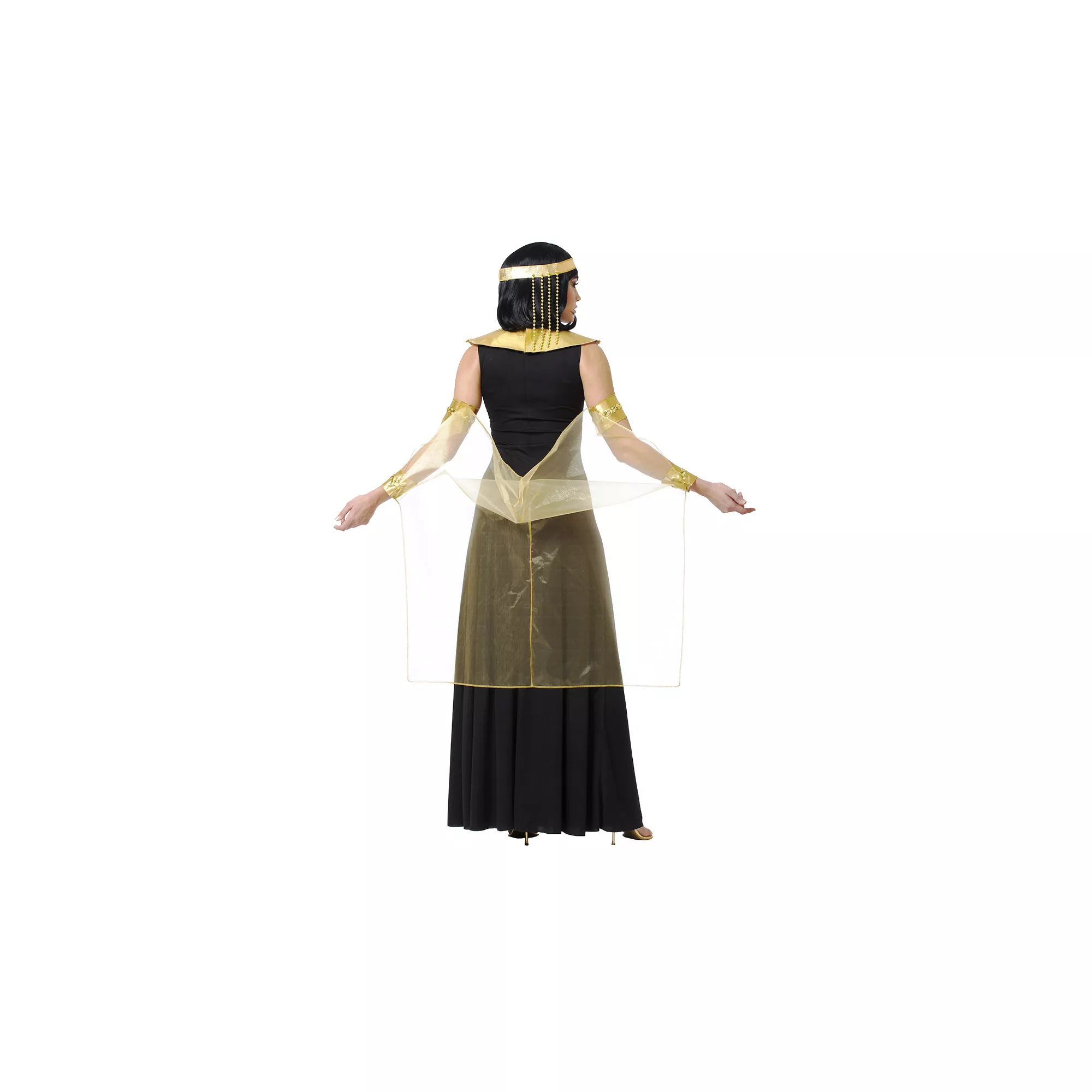 Hold your head high as the last pharaoh to ever rule Egypt in this Cleopatra Black Adult Womens Costume. Dark gown with gold and teal animal print detail, matching neck piece, along with gold headpiece and cuffs with attached sheer cape will instantly turn you into the one and only Cleopatra. Dress your man up as Julius Caesar or Mark Antony for arm candy.