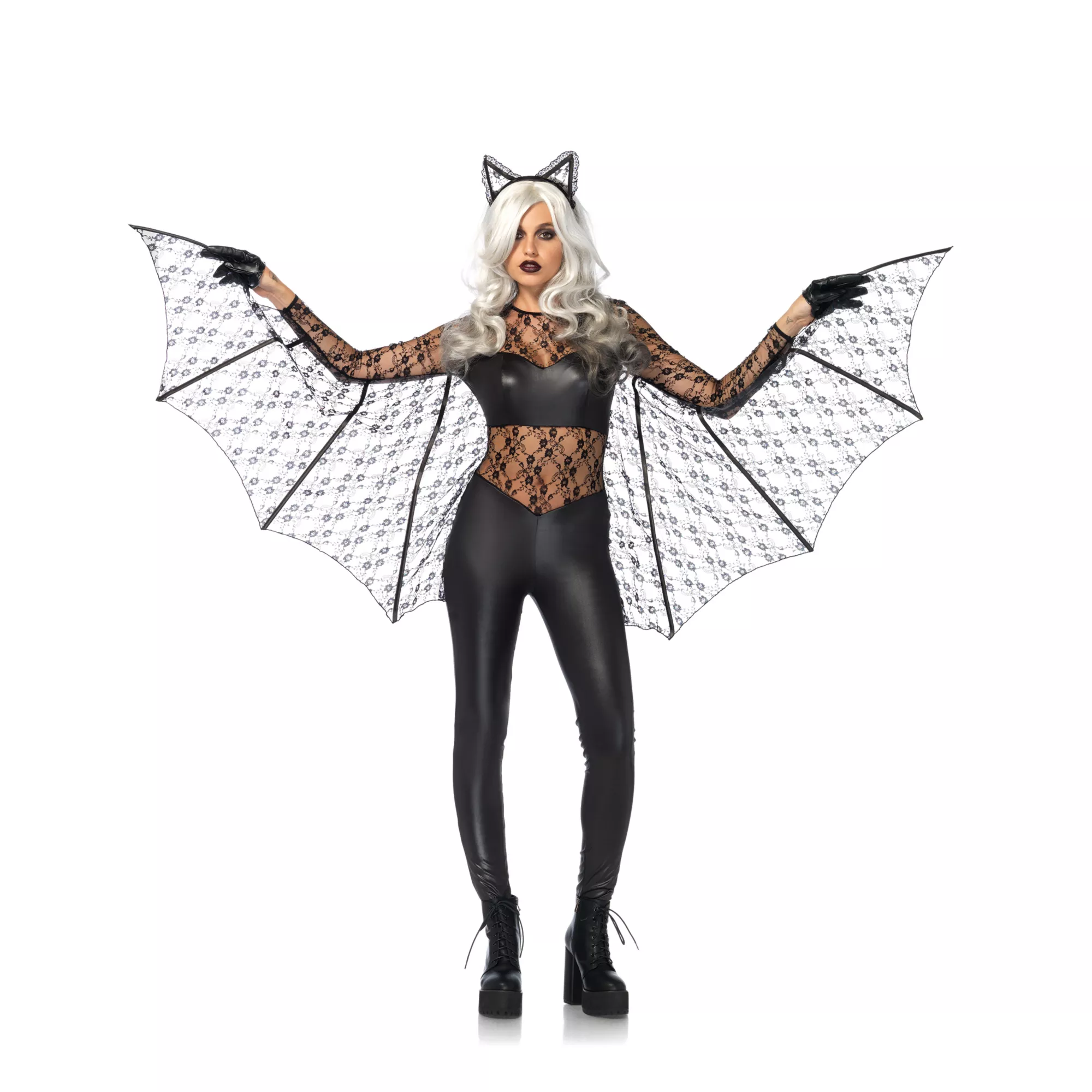 With its skin tight black suit and lace wings, this costume is perfect for any midnight mischief.