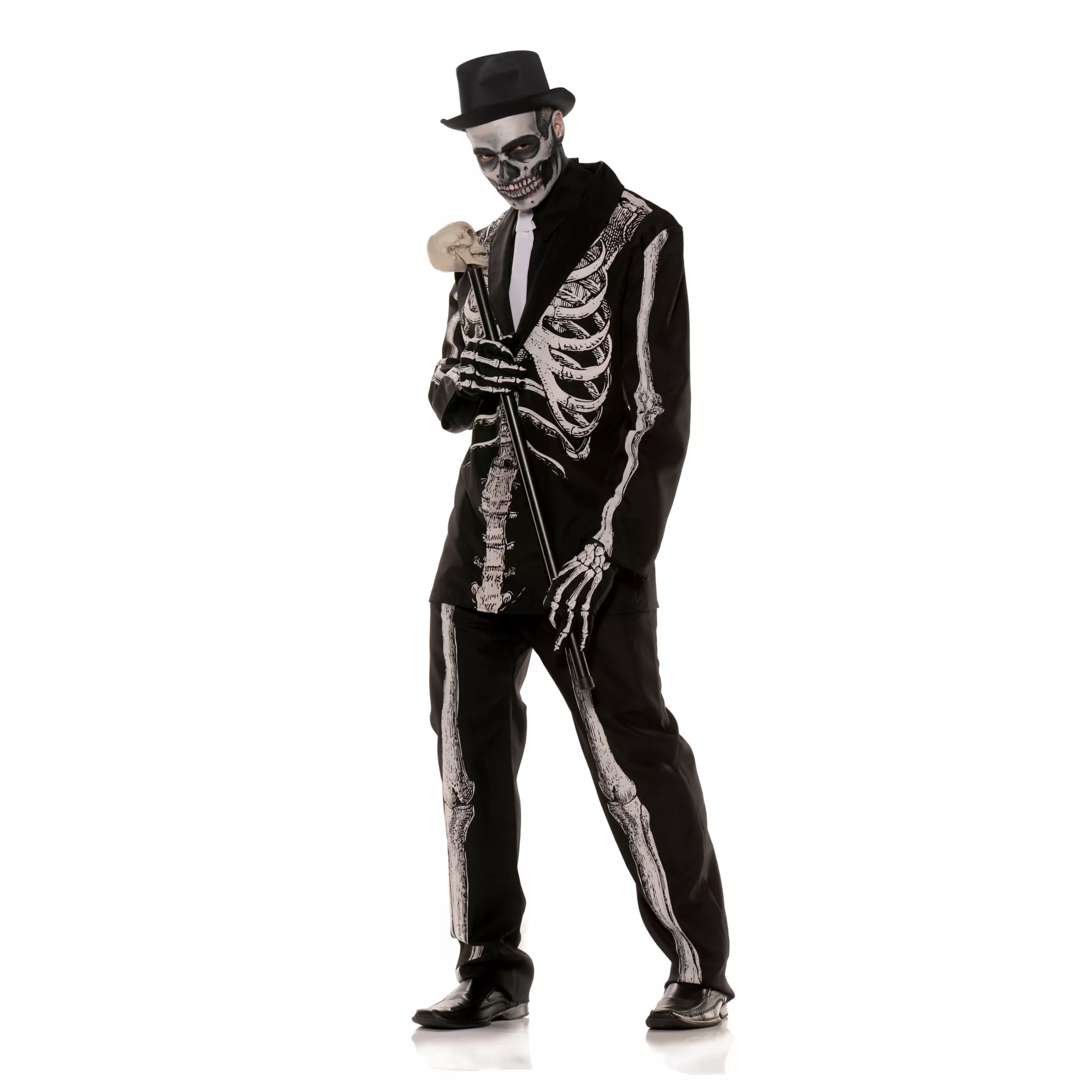 Who said skeletons can't be classy? You'll have an abundance of class when you wear this Bone Daddy Skeleton Tuxedo Adult Mens Costume on Halloween. The skeleton print tuxedo jacket comes complete with matching pants and a faux shirt front with tie.