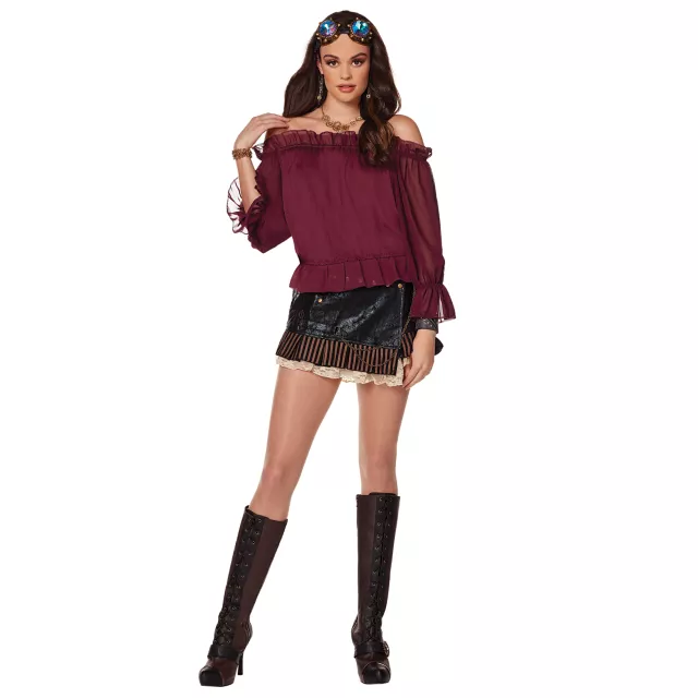 This burgundy top is fun, flirty, and ultra-flattering! Featuring sheer ruffles, loose sleeves that are gathered at the wrist, an off-the-shoulder style neckline, and a cinched waist, this top is perfect for your pirate look or other unique style.