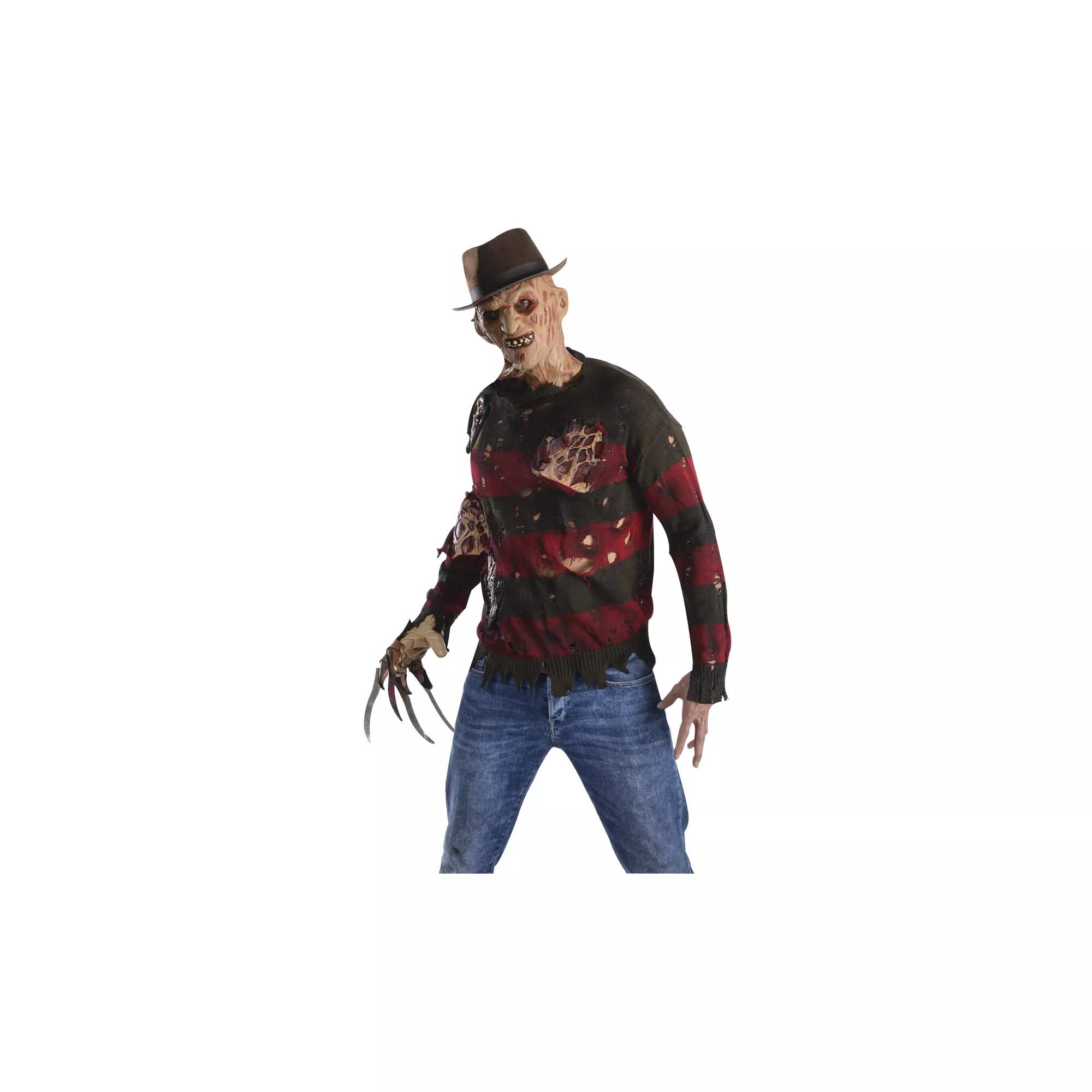 Slash your way to a killer Halloween when you wear the officially licensed Nightmare on Elm Street Freddy Burned Sweater Costume. This red and black sweater features vinyl appliances that look like burning flesh.