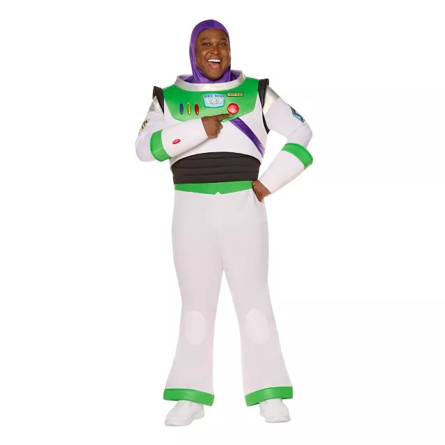 Fly into the party with style this Halloween when you suit up in this officially licensed Buzz Lightyear Costume. Look just like everyone's favorite Space Ranger in this outfit that features a green, purple, and white Buzz Lightyear jumpsuit with attached chest piece, and a purple hood to finish the look. In this costume you'll be one of the coolest looking toys in the toy box this Halloween!
