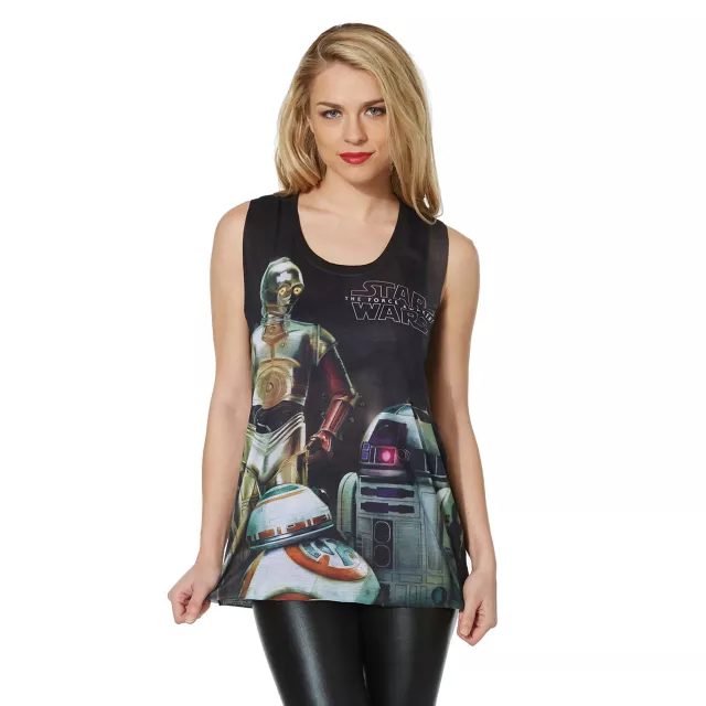 Bring your favorite old school droids and new school droids together when you wear the officially licensed C-3PO BB-8 R2-D2 Star Wars Tank Top! This women's tank features your favorite Star Wars droids.