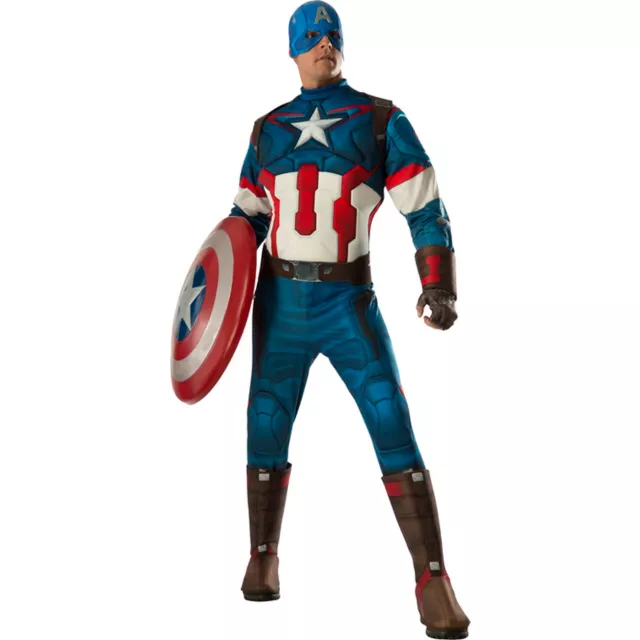 The symbol of freedom is back in Avengers: Age of Ultron and ready to protect the people of Earth! Join the Avengers in the battle against Ultron in this officially licensed Avengers 2 Captain America Deluxe Costume! Features patriotic designed muscle chest jumpsuit in blue with a white star on the center of the chest, red and white vertical stripes along abdomen, and blue sleeves and legs. Also includes brown belt with silver buckle and traditional blue Captain America mask with a white "A" on the forehead and eye holes. Avengers assemble!