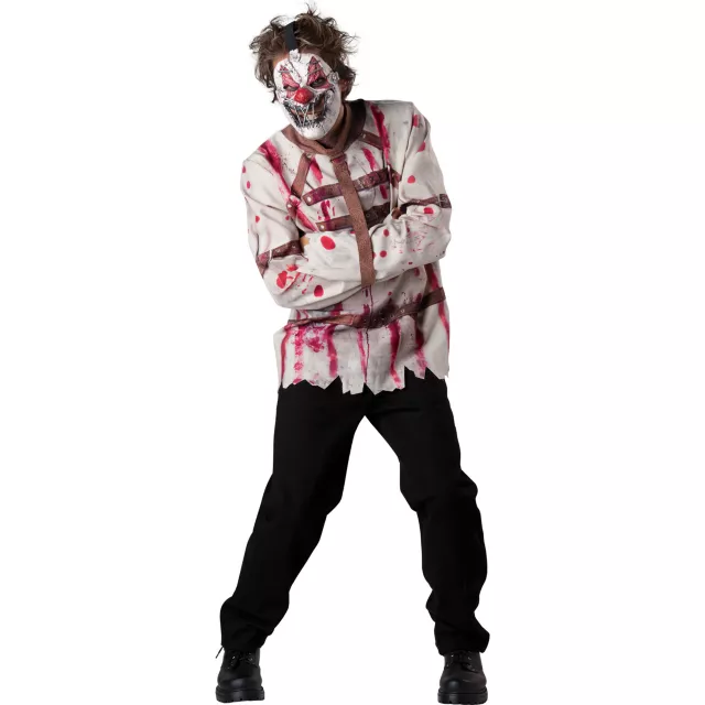 Make your permanent mark on the circus when you go on a spree in the Carnival Killer Adult Men's Clown Costume. Get wild on Halloween in this blood-spattered shirt, complete with collar, faux restraints and a horrifying clown mask.