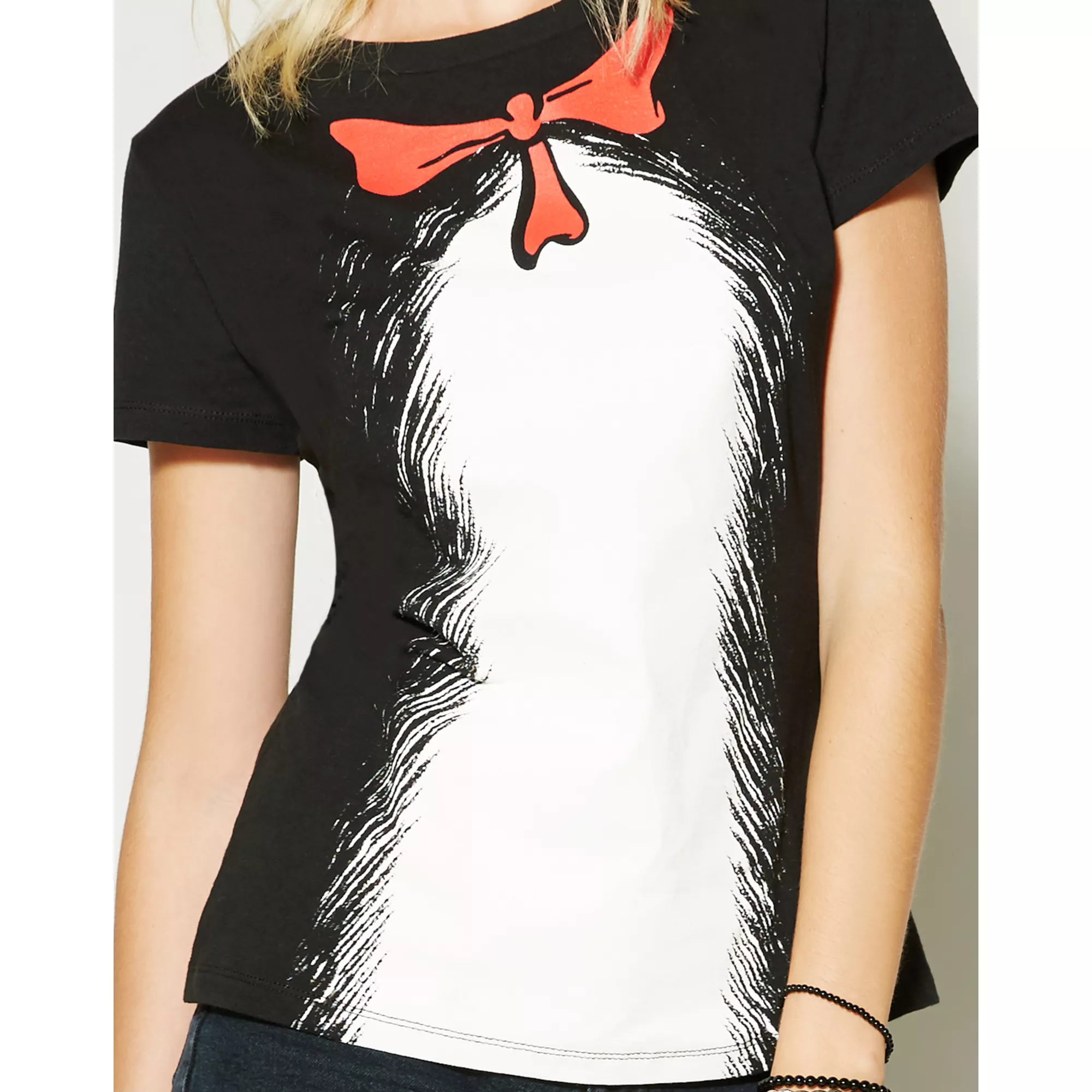 Look just like the fun and mischievous cat when you wear this officially licensed Cat in the Hat T-Shirt - Dr Seuss! The black tee features a graphic white fur stomach and a graphic signature red bow tie. Grab a tall, red top hat (sold separately) and your look will be complete!