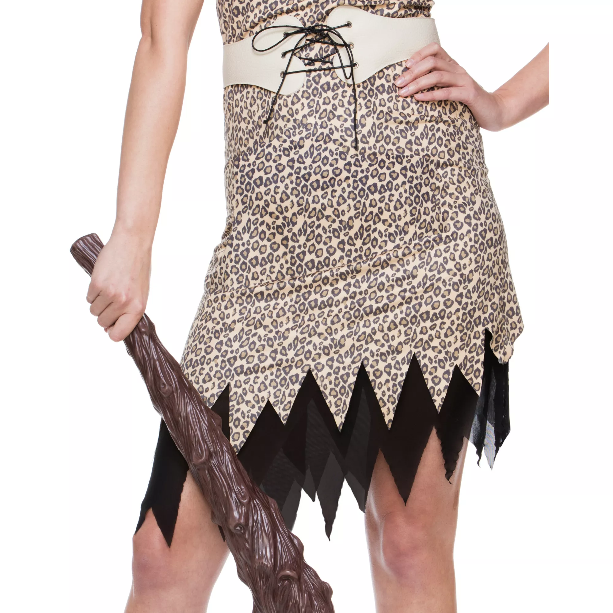 You'll look sassy in this leopard print cave girl dress this Halloween! Fully lined dress features an asymmetrical zig zag hem with a matching asymmetrical neckline. Lace up bone belt, choker necklace and matching headband completed this cave girl look perfectly!