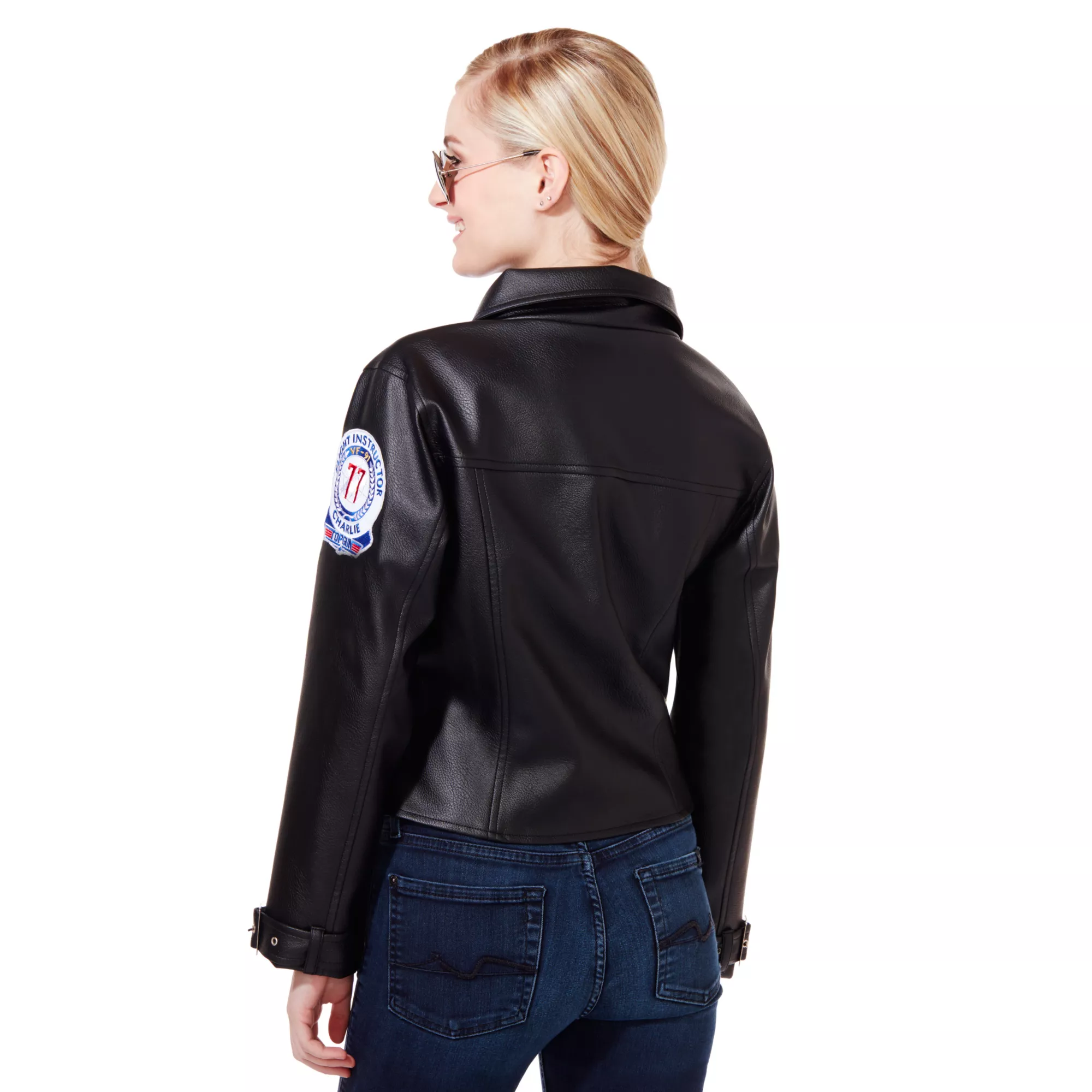 You'll love this faux leather jacket that will make you look and feel just like Charlie from Top Gun! Full zipper front makes getting dressed simple. Collar patch, chest patch, and arm patch give you an officially flight instructor look. Two front pockets offer you storage and adjustable belted detail at the sleeves bring this look together.