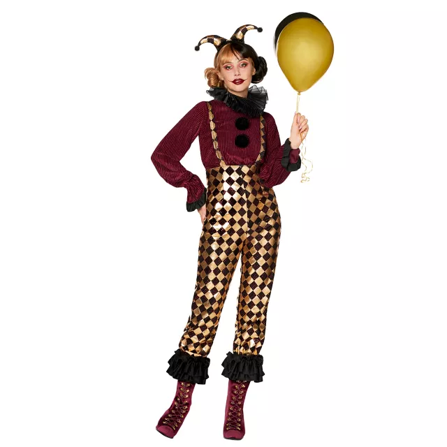 From Our Exclusive Signature Collection. Constantly clowning around? Let the world know you're the ultimate jokester when you wear this Checkered Clown Costume. This high-quality outfit features gold and black checkered pants, a dark red shirt with black accents, a black collar, and a jester-style hat to complete the look. Suit up in all the included gear and practice those juggling skills. The show is about to start!