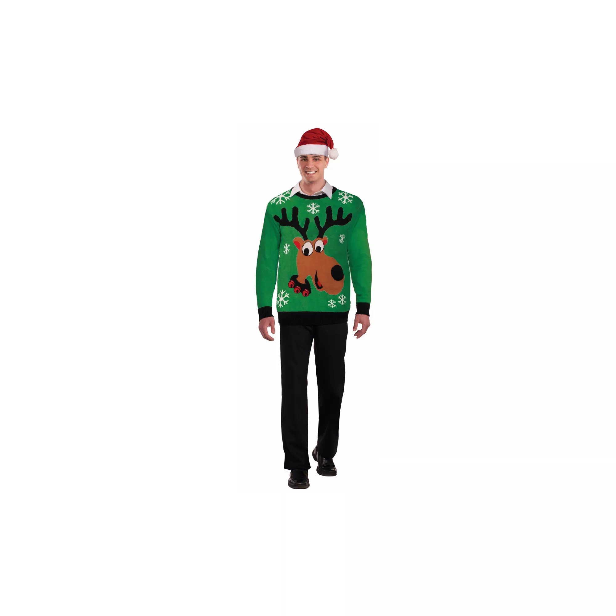 Make your way to the ugly sweater party in style with the Christmas Reindeer Adult Sweater! This jolly green sweater features snowflakes designs and an adorable reindeer that will have party guests grinning from ear to ear.
