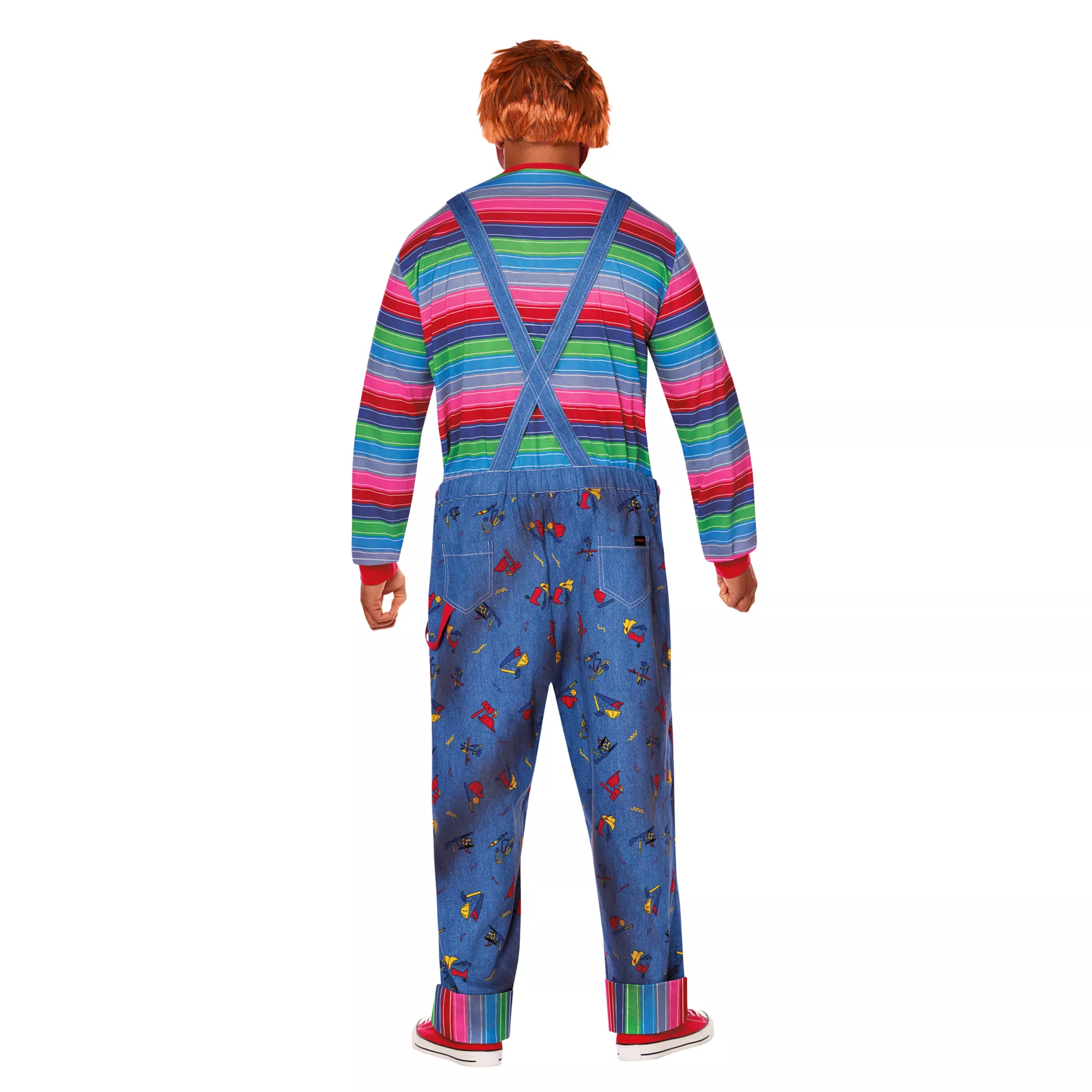 Playtime's about to get a whole lot creepier this Halloween once you suit up in this officially licensed Adult Chucky Costume Deluxe. This high-quality costume will have you looking just like your favorite killer doll this Halloween. This costume includes a multi-colored striped long sleeve shirt, a pair of Chucky's signature embroidered overalls, and a terrifying Chucky half mask with facial scar details to look just like you came off right of the big-screen. There's no better way to look just like your favorite horror villain this Halloween than with this awesome deluxe Chucky costume.