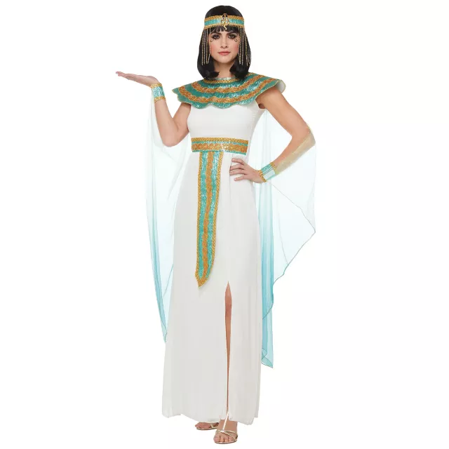 Strut your stuff like the Queen of the Nile herself when you wear this gorgeous Cleopatra costume! Layers of white fabric are detailed with gorgeous turquoise and gilded accents like the removable cobra brooch that's strategically placed upon the headband. The coordinating accessories will add the finishing touches and transform you into one of Egypt's most famous and beautiful pharaohs.
