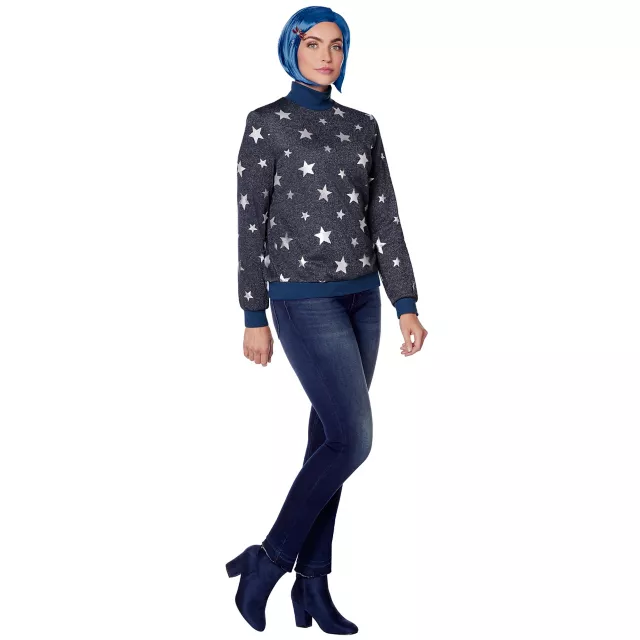 Be ready to enter an alternate world in this Adult Coraline Costume! In this blue sweater adorned with white stars and Coraline wig, you'll look just like your favorite movie character.