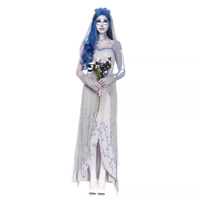 Maybe you need something blue to fit the dead you? The Corpse Bride Deluxe Dress Adult Women's Costume makes your walk down the aisle a bit more scary. With a beautiful gray-blue gown with skeleton print arms you'll entice guests both living and dead. Say "I do" to your new gorgeous and vibrant blue locks topped with sweeping veil adorned with flowers. Shock with your hauntingly good looks, even if they are covered in a ghostly complexion. This costume will live through the ages even if you aren't.