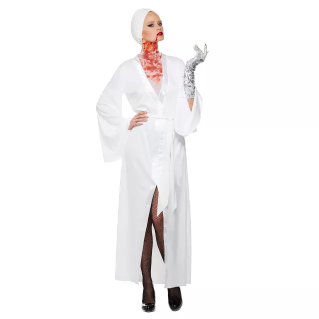 Raise your own Vampire family with this American Horror Story Countess costume. The long white robe features satin detail for a shine that is all your own. Mesh at the chest is covered in blood to show that you love feeding your Vampire instincts. Includes cloche head wrap that brings the entire costume together.