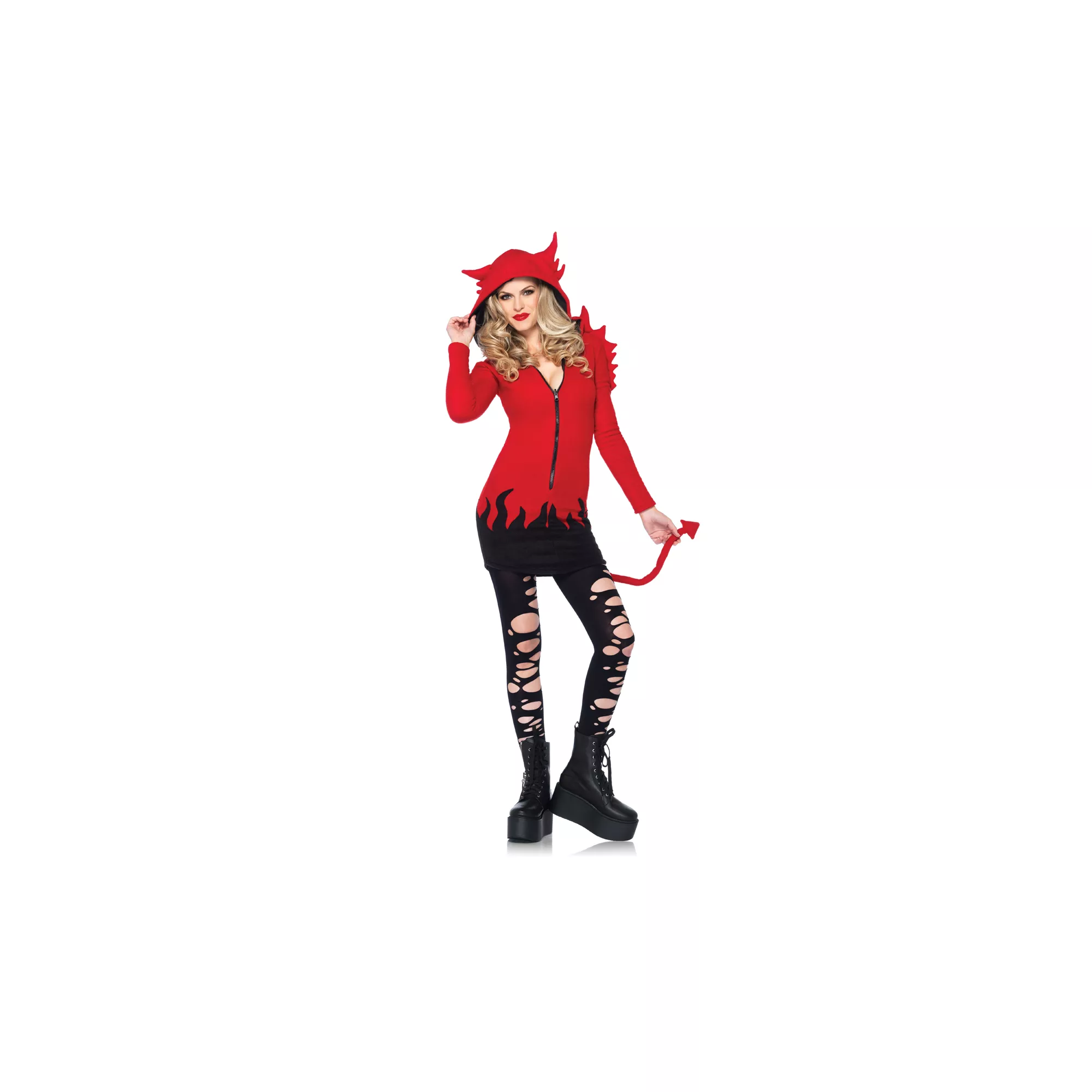 Everyone will want to cuddle up next to this devil in the Cozy Devil Adult Women's Dress. Redefine smoking hot in this fleece dress with black flame detailed bottom, zipper front, horned hood, and wing and tail attachments.