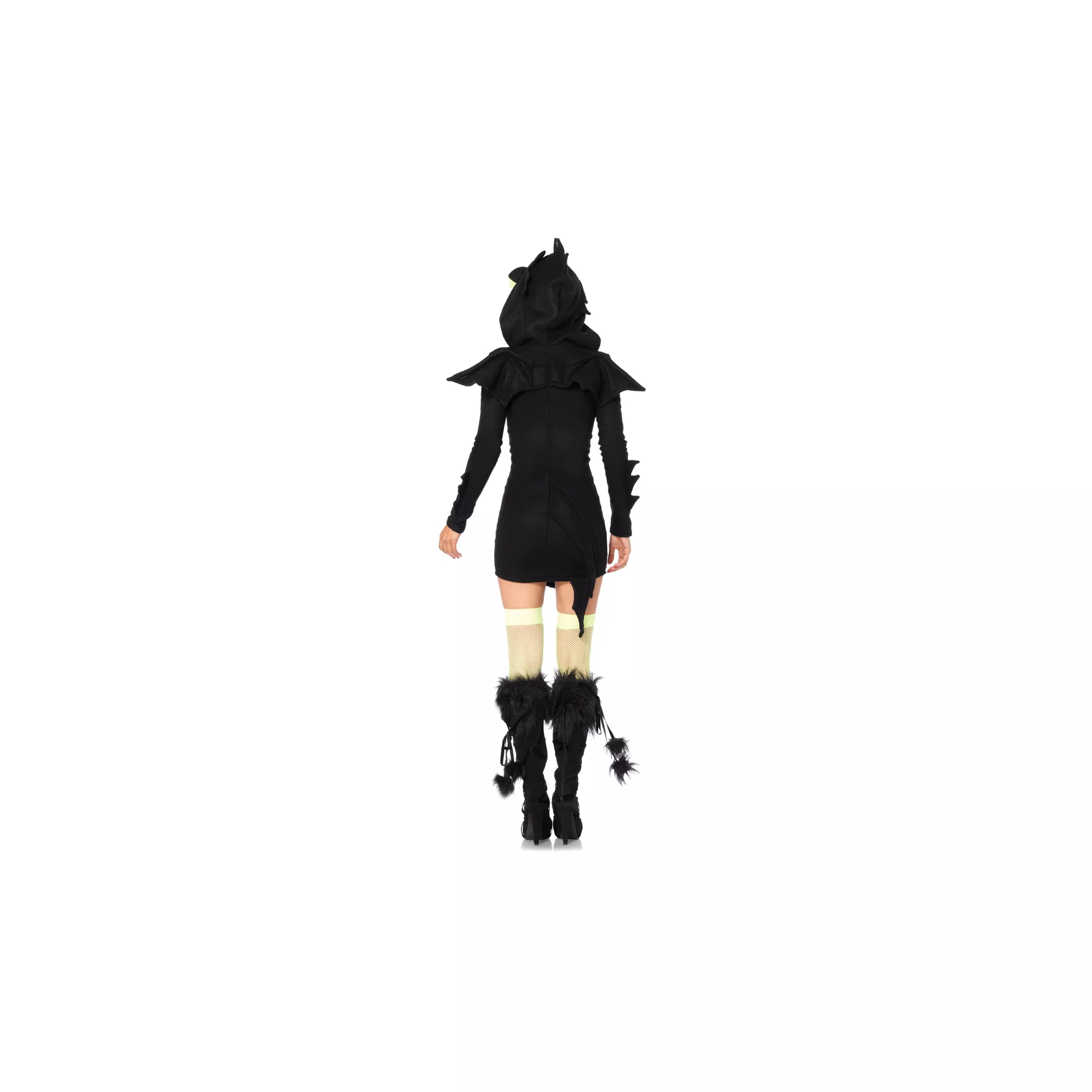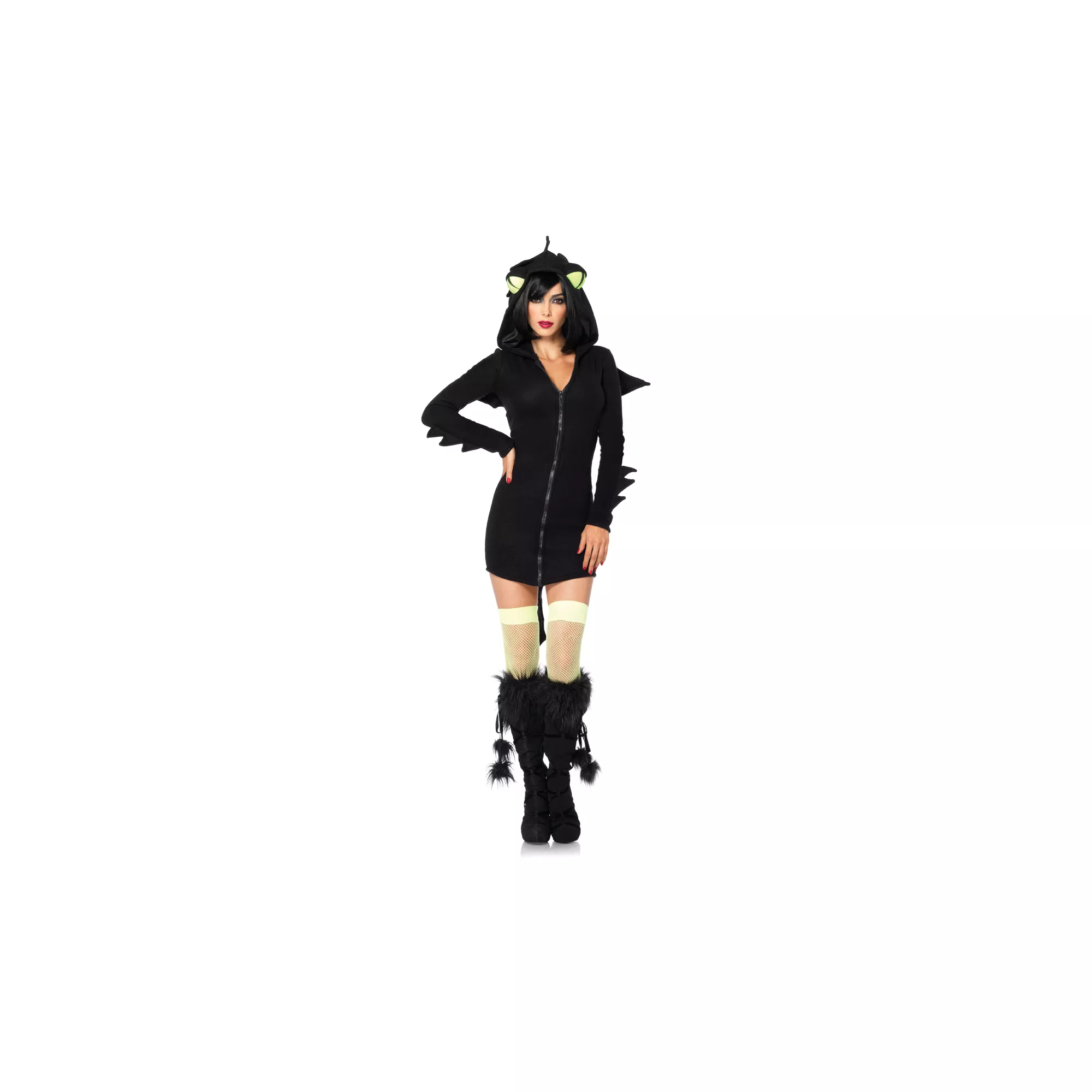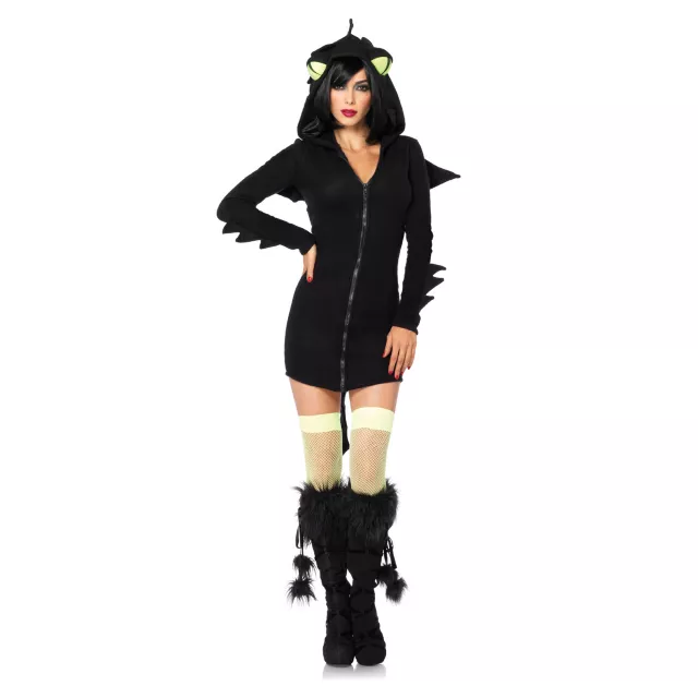 If you've ever wanted a pet dragon and cursed the knights who slew them you'll want to rock the Cozy Dragon Adult Women's Costume. This black fleece dress features wings, tail and reptile green eye detail. You'll have knights falling over you as this fire-breathing creature.