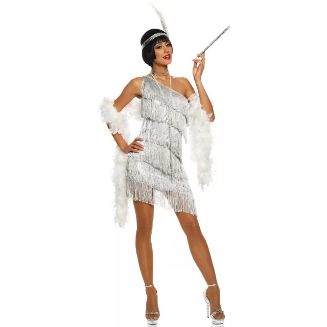 Shake it up when you party on Halloween in this Dazzling Flapper adult womens costume and knock their socks off. The silver dress of this flapper costume features a well-hidden side zipper and comes complete with a choker and a feathered headpiece.