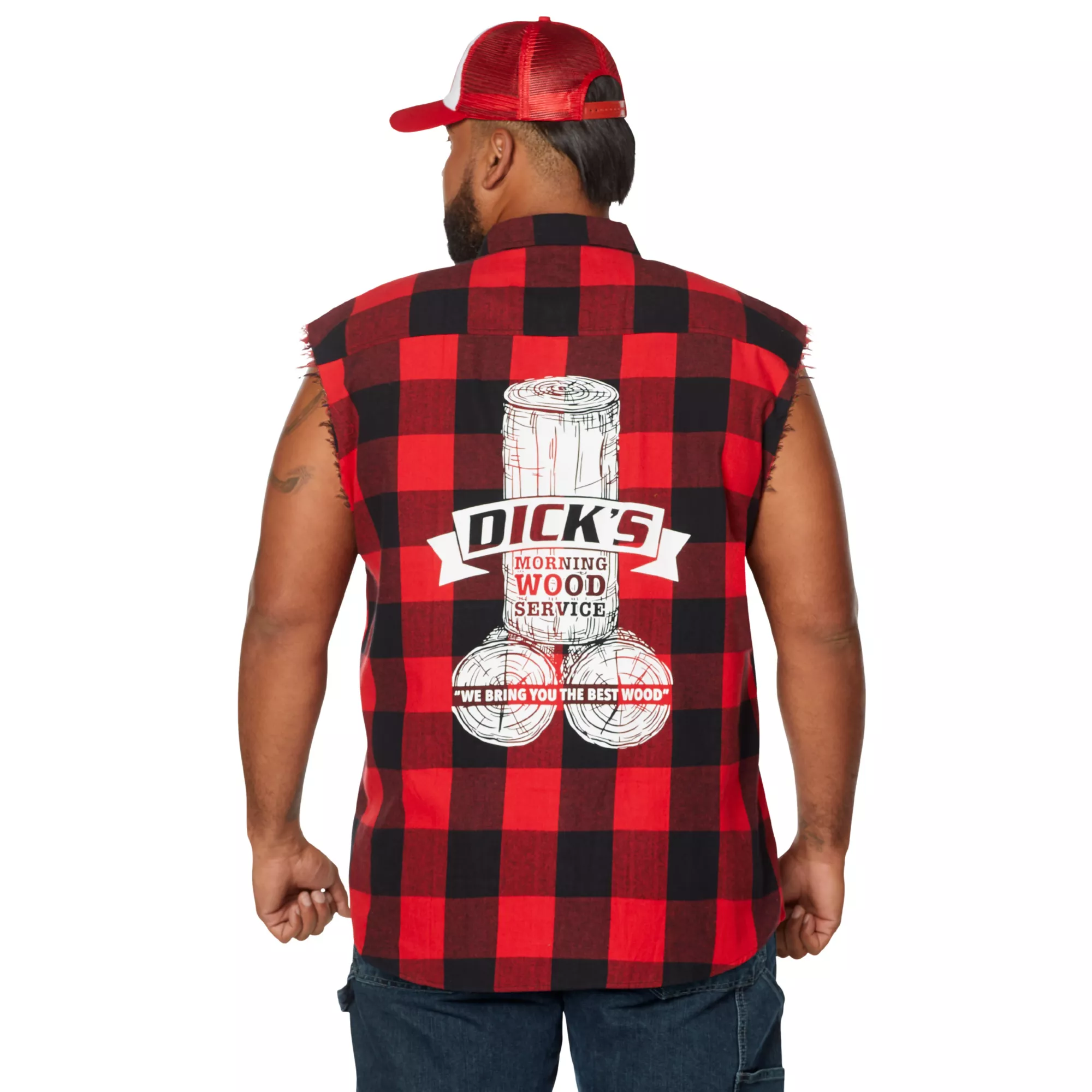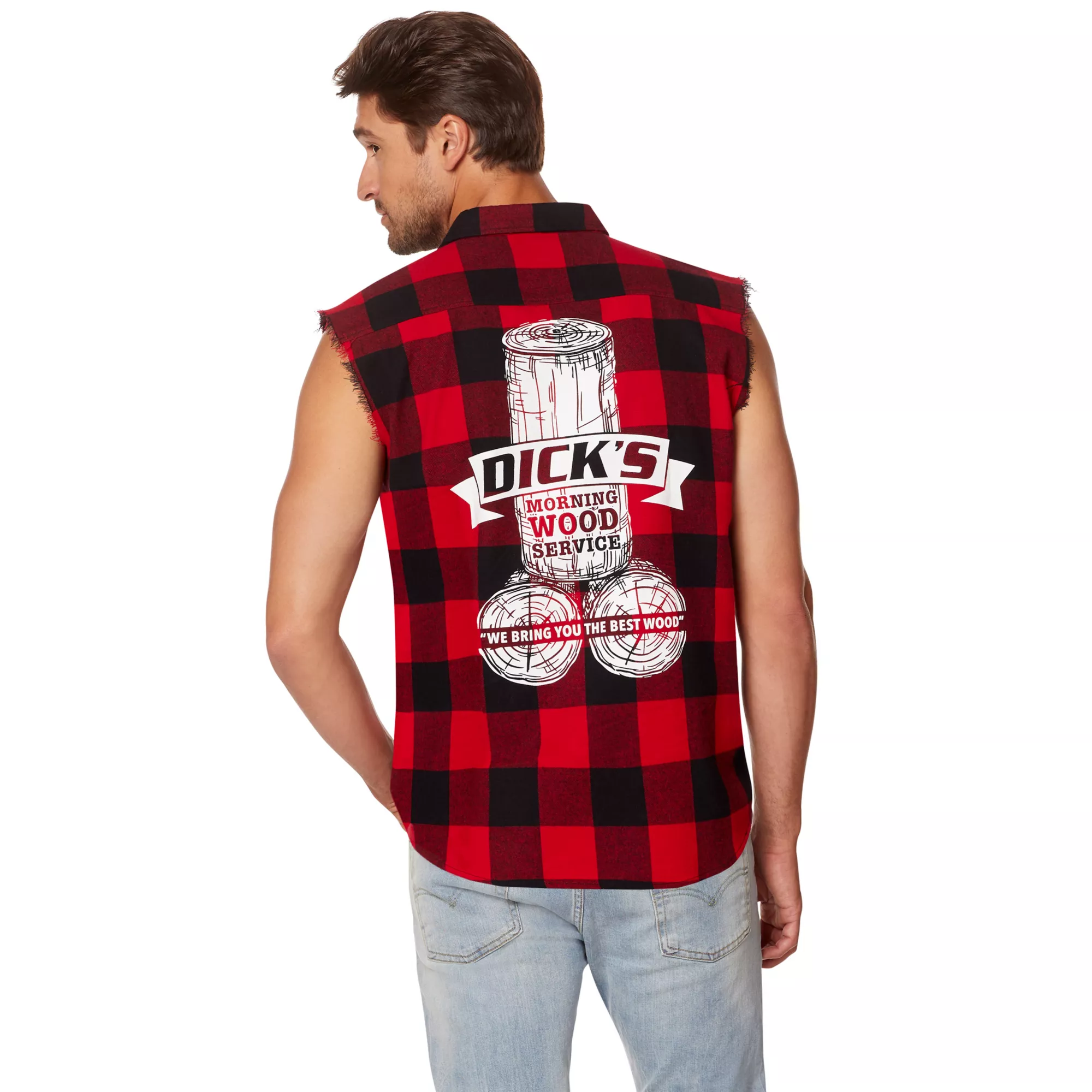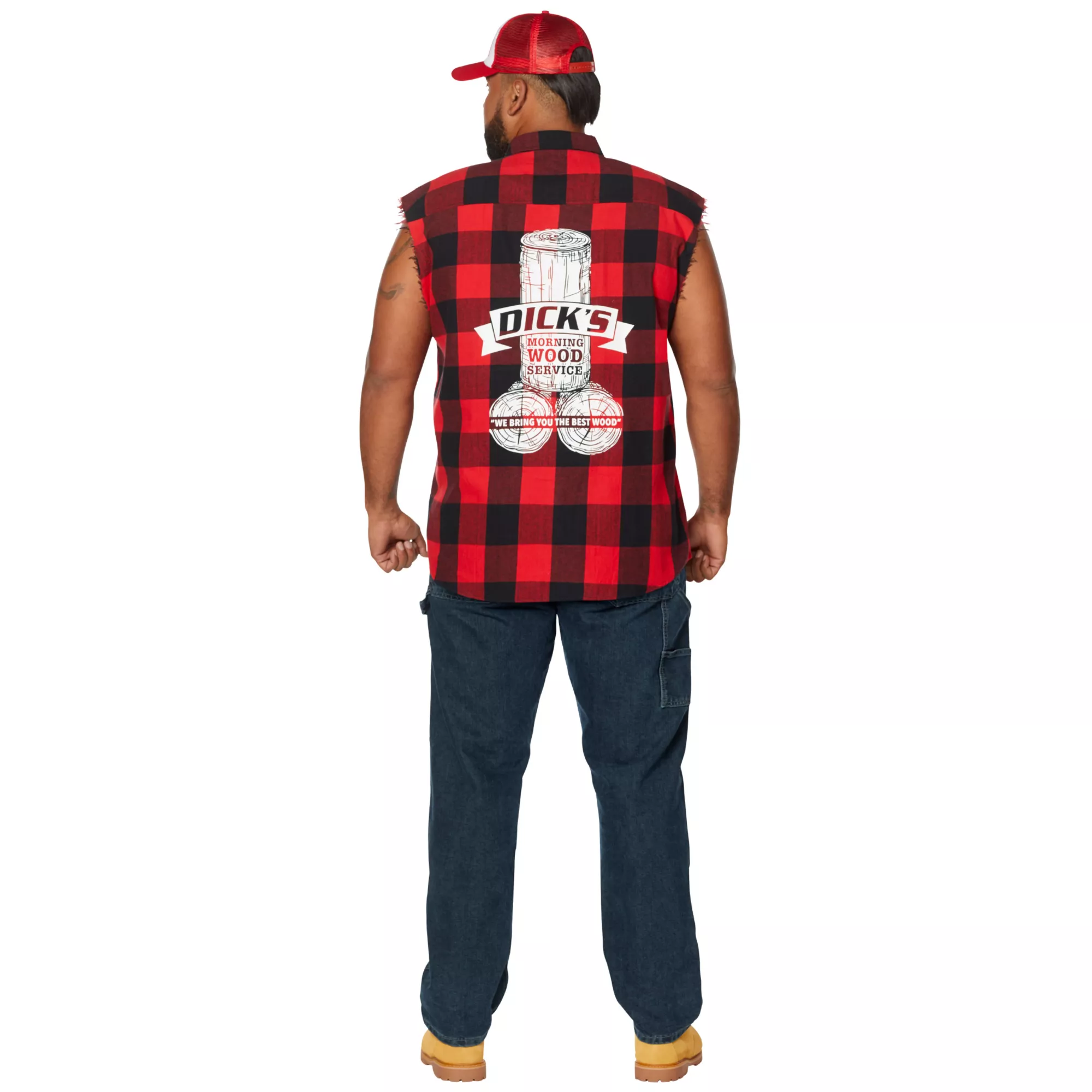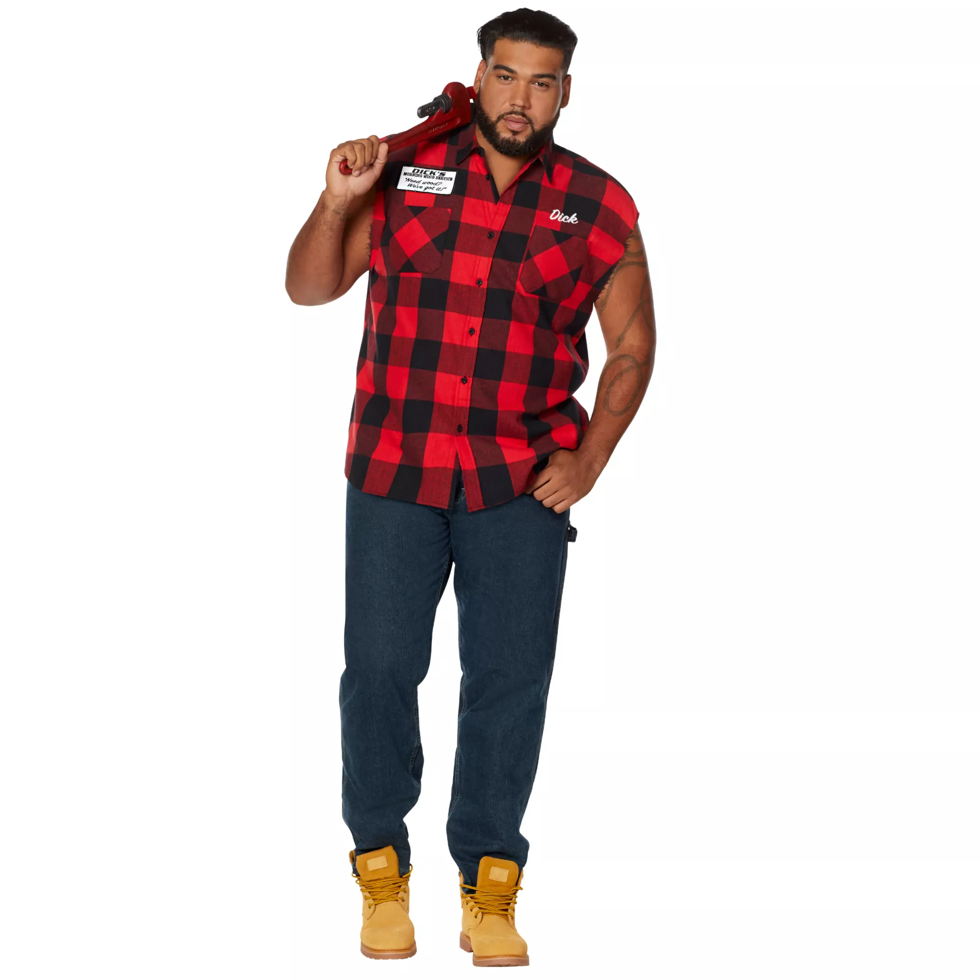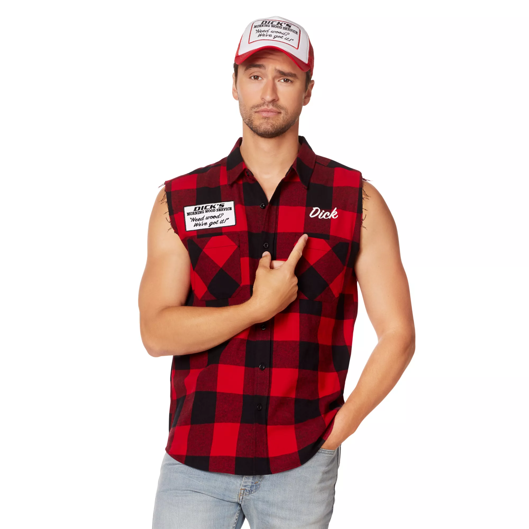 Bring around the best wood this Halloween when you dress up in this Adult Dick's Morning Wood Service Vest. This hilarious plaid vest features a Dick's morning wood service logo on the back and is the perfect start to any lumberjack or redneck costume. You're sure to get plenty of laughs when you sport this red plaid vest at the costume party this Halloween.
