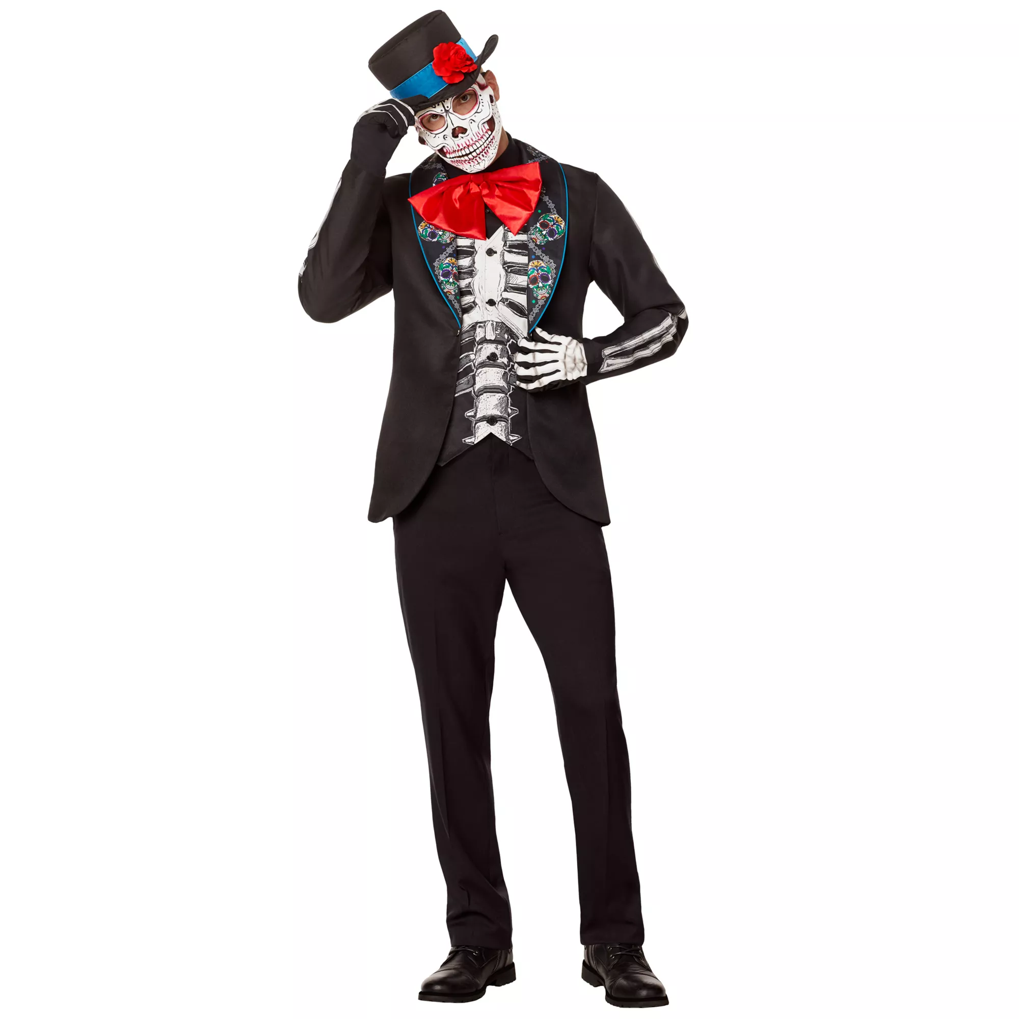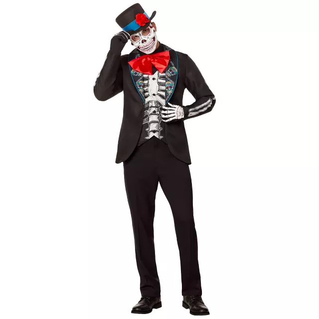 Tip your hat to all dearly departed souls and prepare to celebrate Dia de los Muertos! This Adult El Hombre Calavera Costume features traditional Day of the Dead details with a skeleton print lapel, an oversized red bowtie, and flowery top hat. Let’s dance!