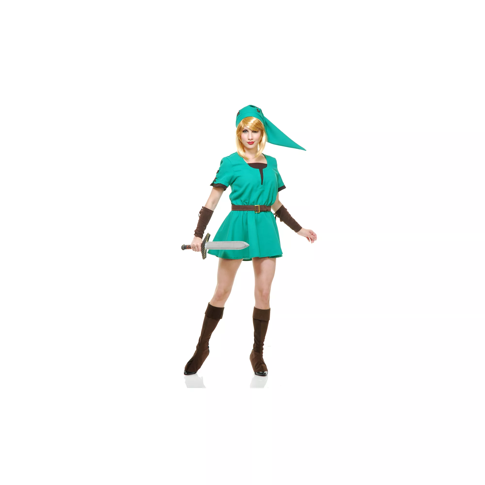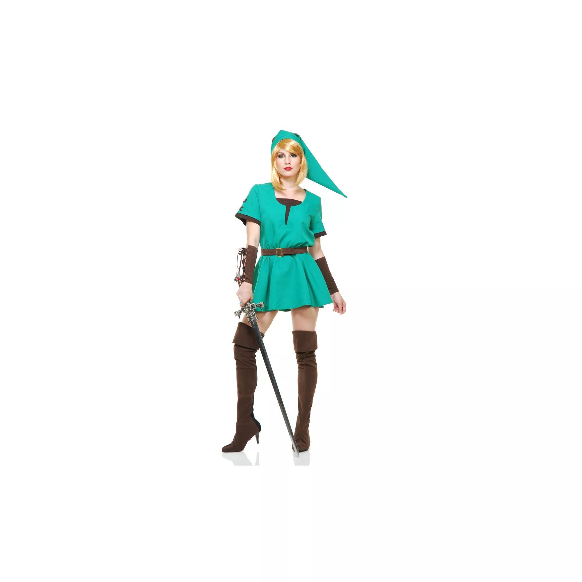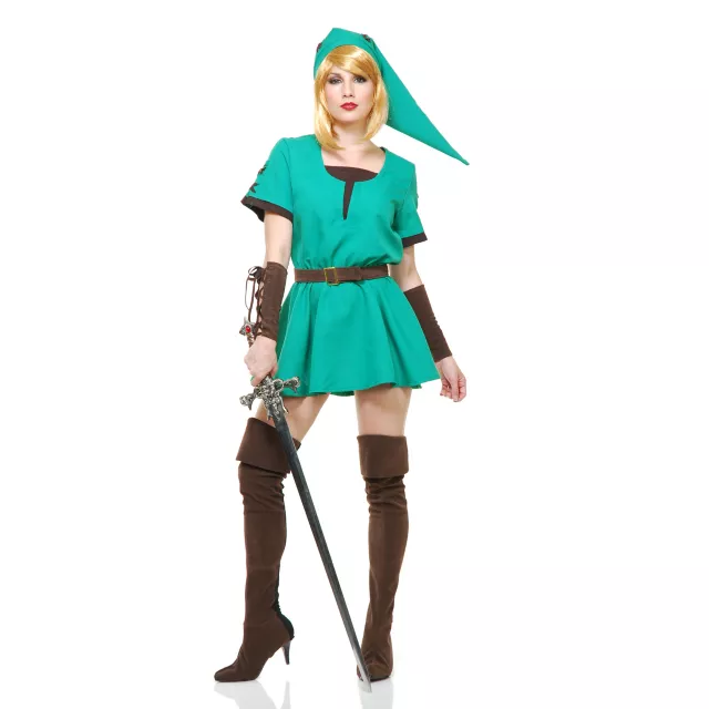 Battle for the freedom of your people when you suit up in the Elf Warrior Princess Adult Women's Costume. This green and brown, polyester dress comes complete with a matching hat, lace-up wrist guards, a brown belt and brown suede like boot covers.