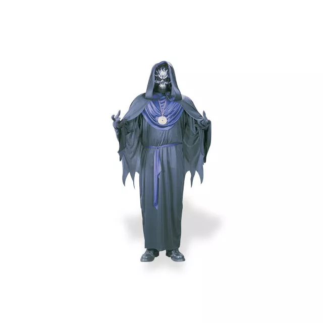 The forces of evil may finally win out when you show up in this imposing Emperor of Evil Adult Mens Costume. This scary costume includes imperial robe, regal purple drape, black hooded cape, matching gloves, gold medallion and sinister skull mask. Everything you need to turn this world into a living nightmare!