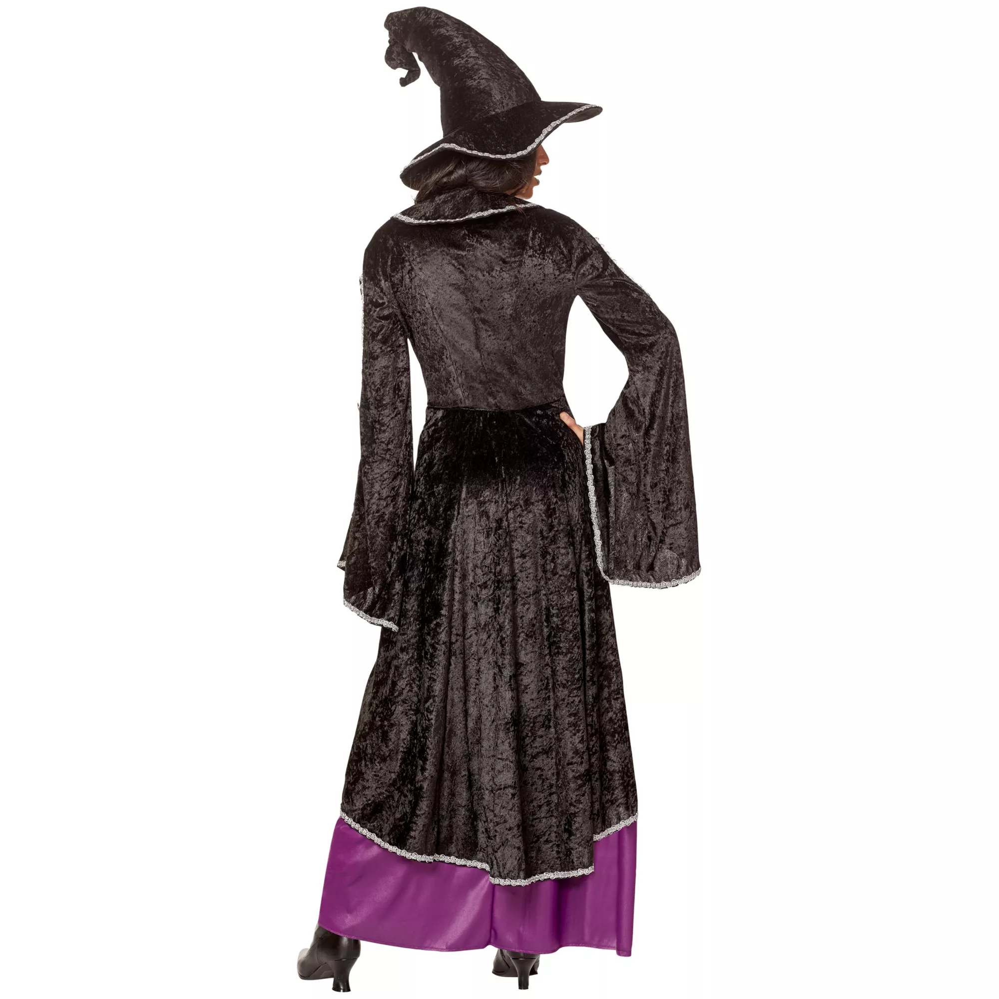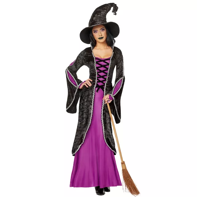 This spellbinding Adult Enchantress Costume is a Halloween classic! Captivating tones of black and purple adorn this corset-front dress with billowing sleeves and a high neck. Top off the look with a charming hat! You will look and feel like a true enchantress in this bewitching costume.