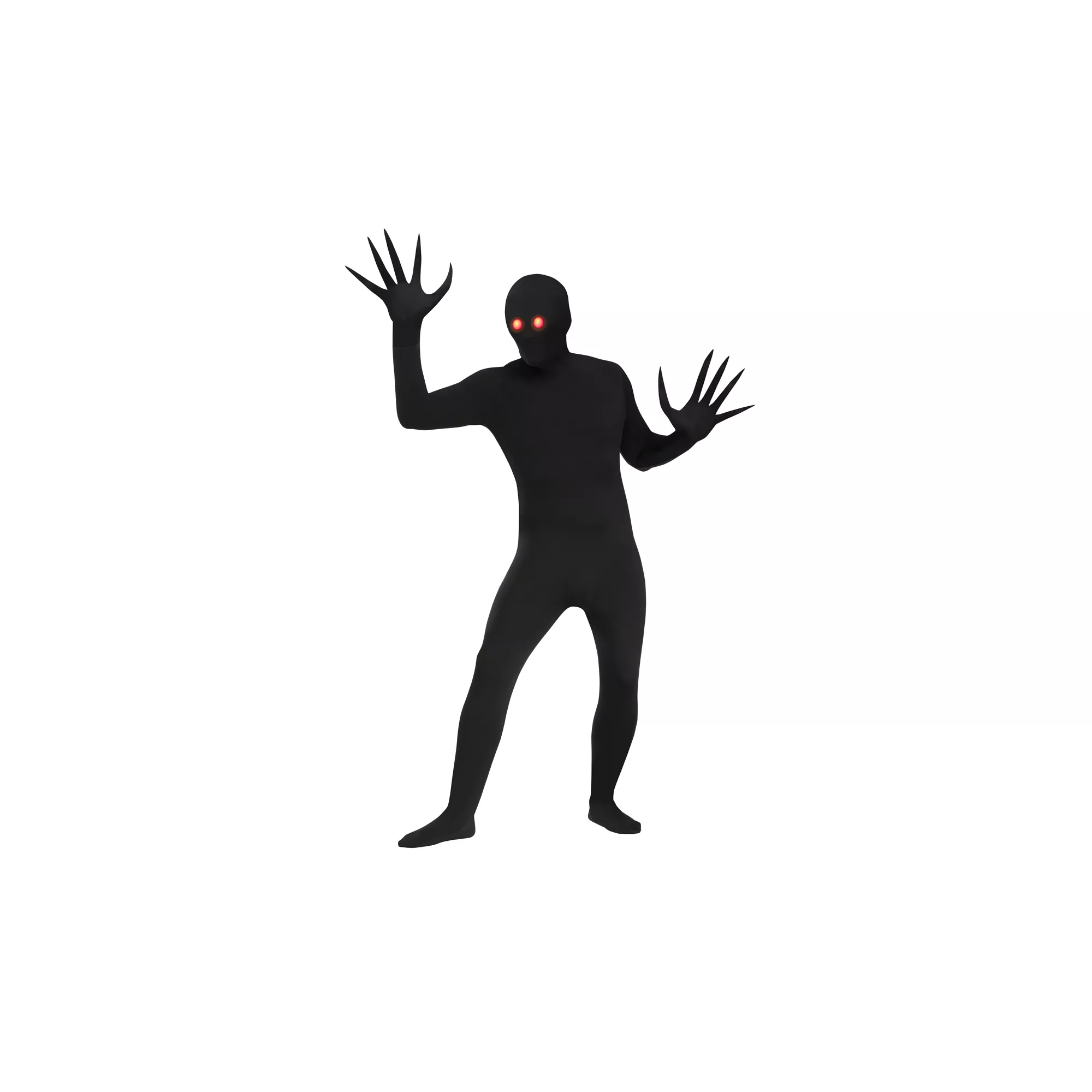 Freak out the neighbors when you wear the Fading Eyes Adult Skin Suit. This see-through and breathable, black jumpsuit features red eye details, that spookily fade in and out.