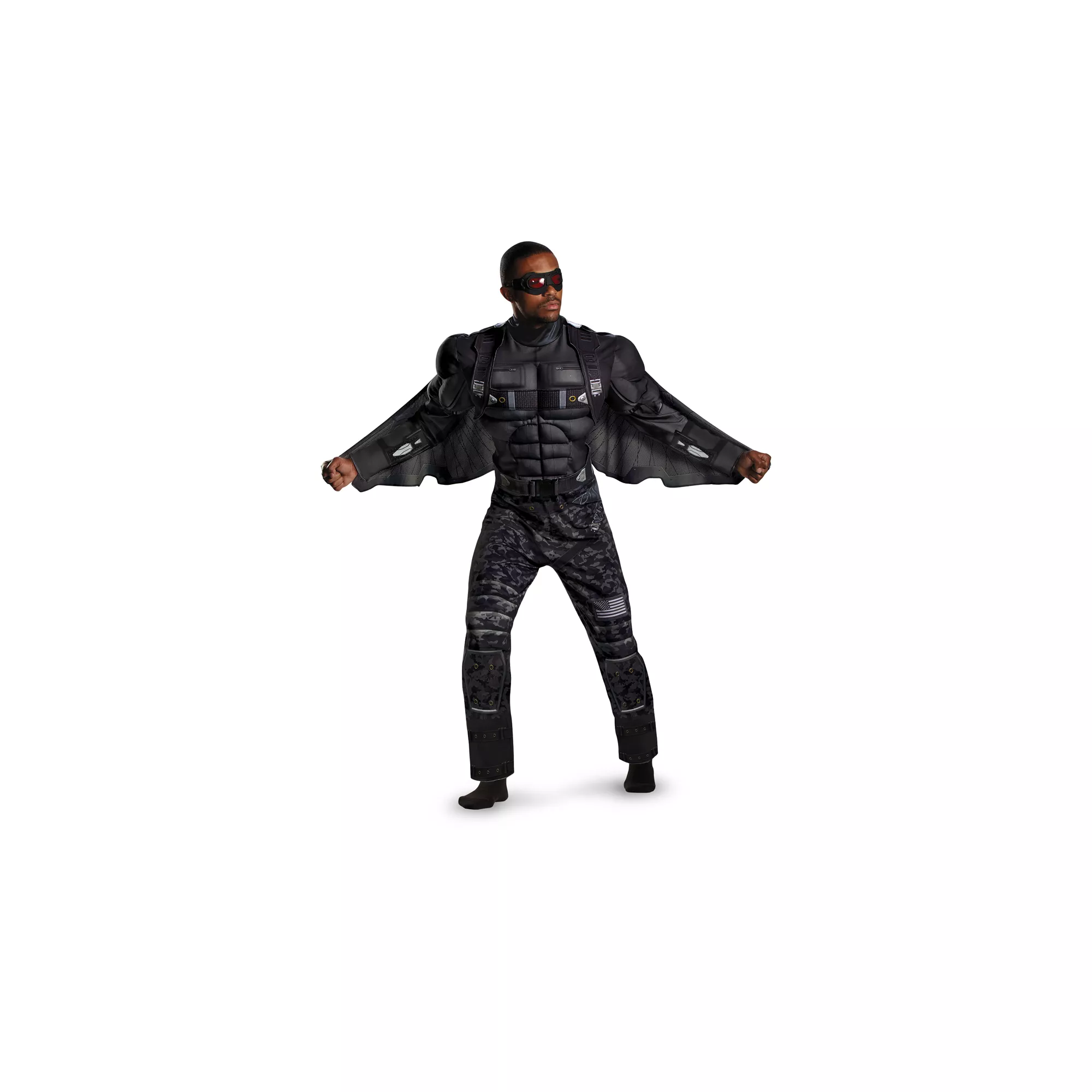 Take flight on Halloween and protect the neighborhood when you wear the officially licensed Captain America Falcon Adult Men's Costume. This black and grey character jumpsuit features muscle chest details and comes complete with detachable wings and a latex character goggles.