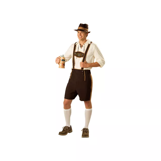 Embrace Oktoberfest by wearing this Bavarian Guy Adult Costume! This costume features a white pull over shirt with lace-up collar, brown lederhosen with tan detailing and a graphic design across the chest, and brown and tan hat. Just grab a pint and act like a true German in this costume!