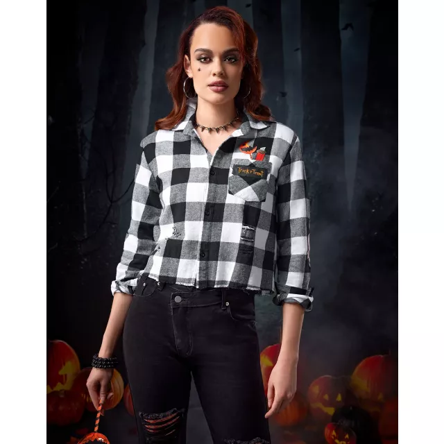 Celebrate your favorite horror movie in this official Trick 'r Treat Flannel Shirt! This black and white checkered shirt says "Trick 'r Treat" on the front in orange alongside an image of Sam's bitten lollipop, Sam patches on the elbows, and "Always Check Your Candy" on the back, making it the perfect Halloween season attire.