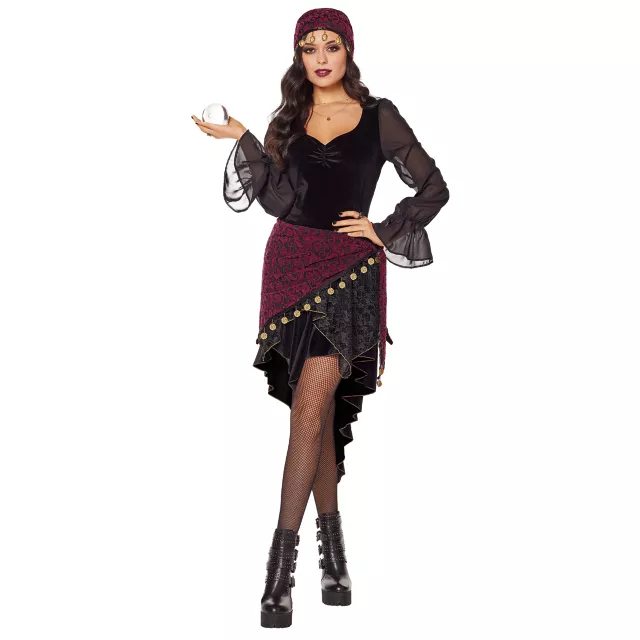 We're sensing a beautiful Halloween outfit in your future. The Adult Fortune Teller Costume will turn you into the ultimate tarot card and palm reader! Featuring a dress, hat, waist cincher, and scarf, this costume is sure make you stand out this Halloween.