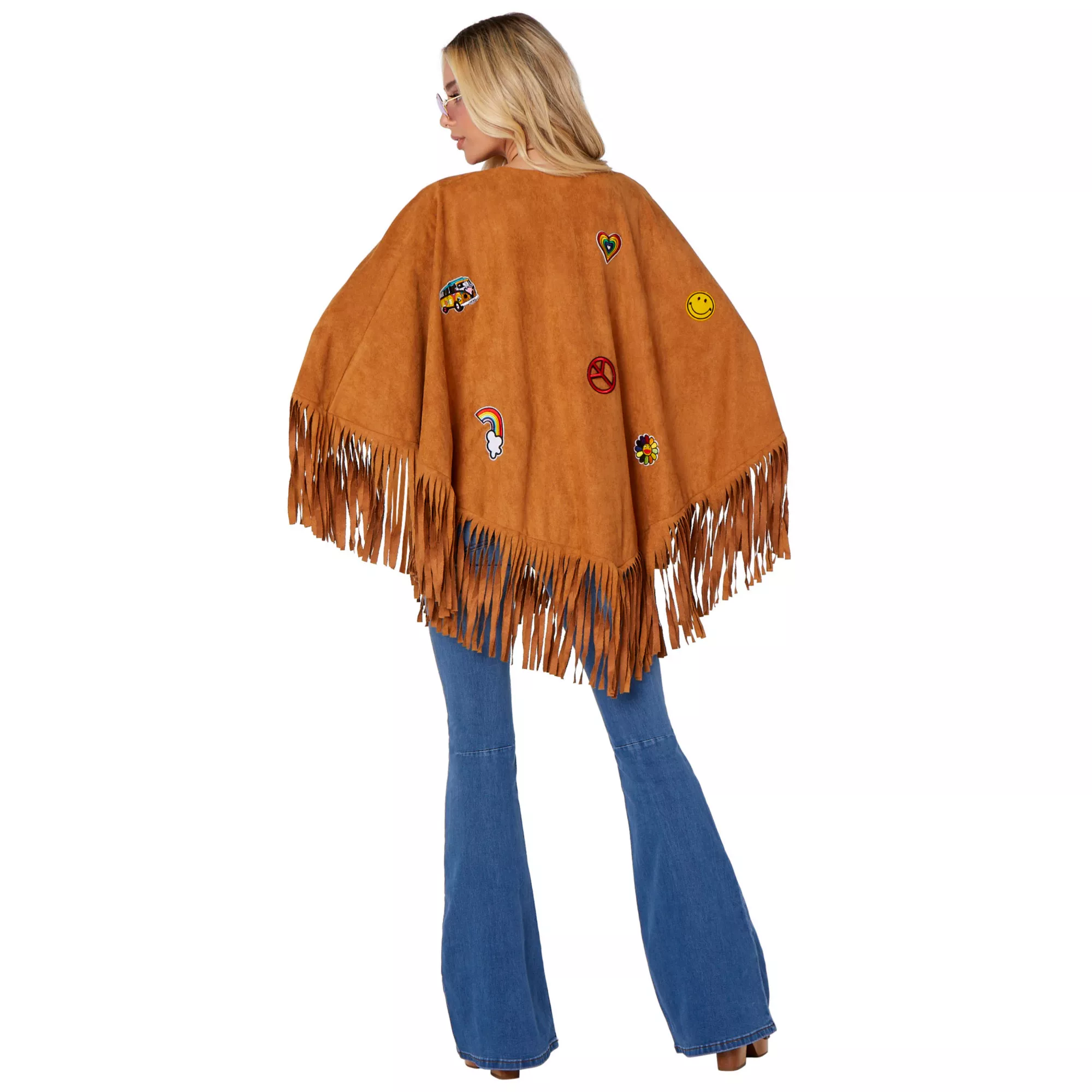 It's time to get groovy! Rock this Adult Free Spirit Poncho Hippie Costume and embrace peace and love this Halloween. This costume includes a poncho with attached patches, a sweet pair of sunglasses, and a necklace that will complete your flower child look!