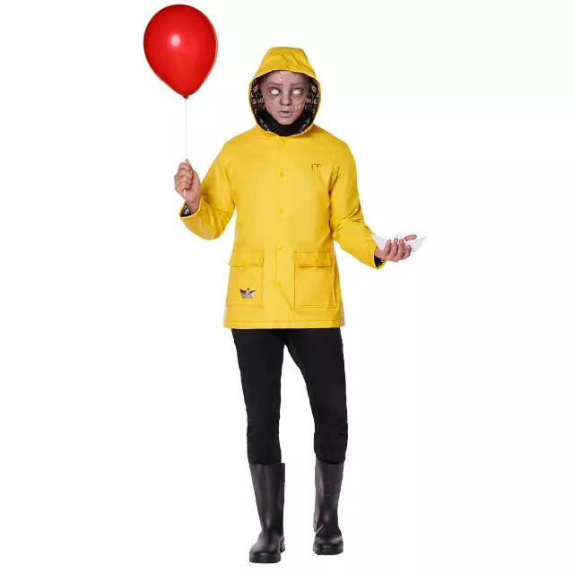 You'll float, too, when you wear this adult Georgie costume! This officially licensed It costume includes a yellow rain coat, a self-inflating red balloon, and a hair-raising Georgie mask. Horror fans will appreciate this authentic Georgie costume!