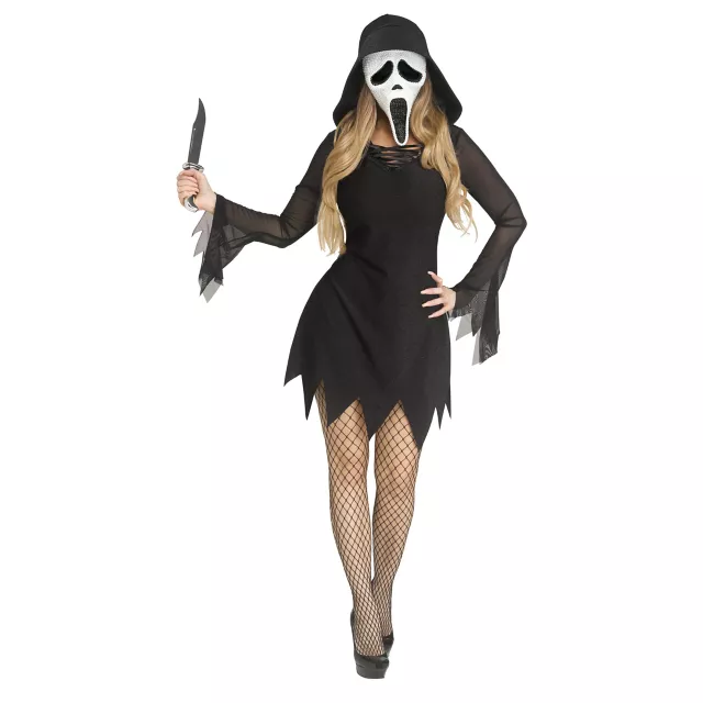 Prepare to spread terror this Halloween when you slay this officially licensed Adult Ghost Face Bling Dress Costume. Featuring Ghost Face's iconic mask bedazzled in rhinestones and a black hooded dress, this outfit has everything you need to horrify your friends, family, and neighbors!